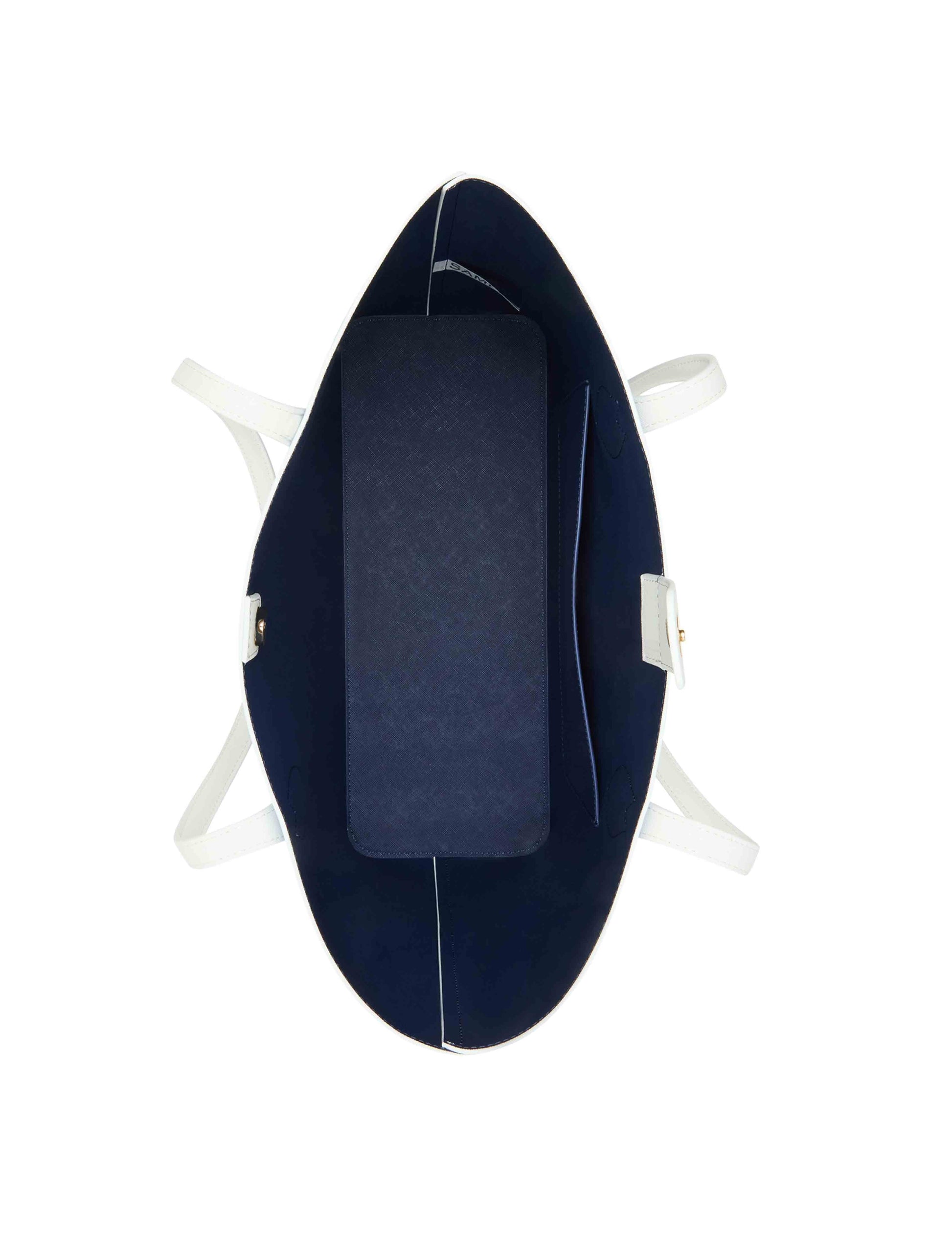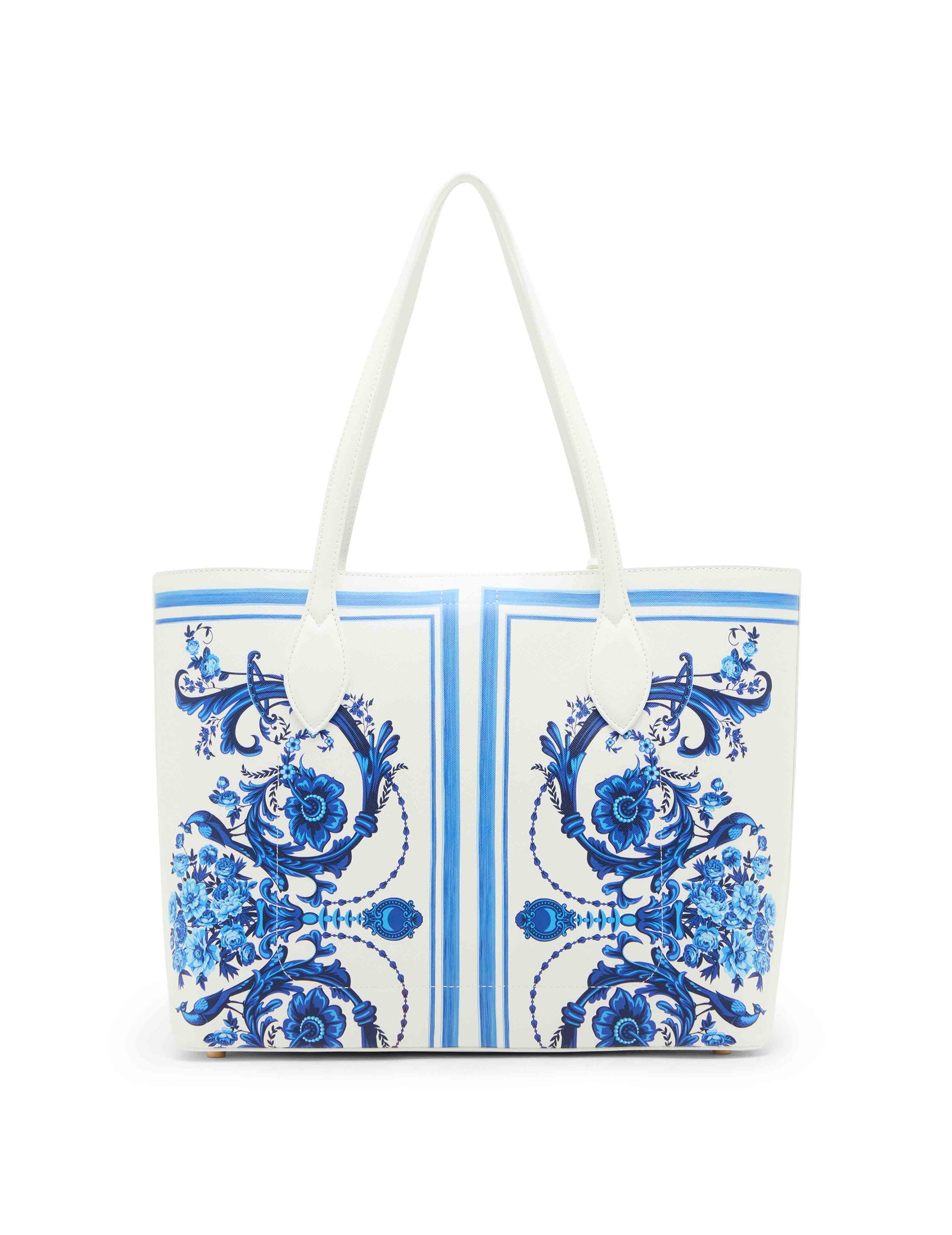 This bonded tote is all about its soft and feminine toile pattern. It has a cute branded hang off that can be removed if preferred and comes with a convertible strap. Because of its bonded material makeup, this handbag has no interior lining. This handbag also has branded metal feet for added protection.