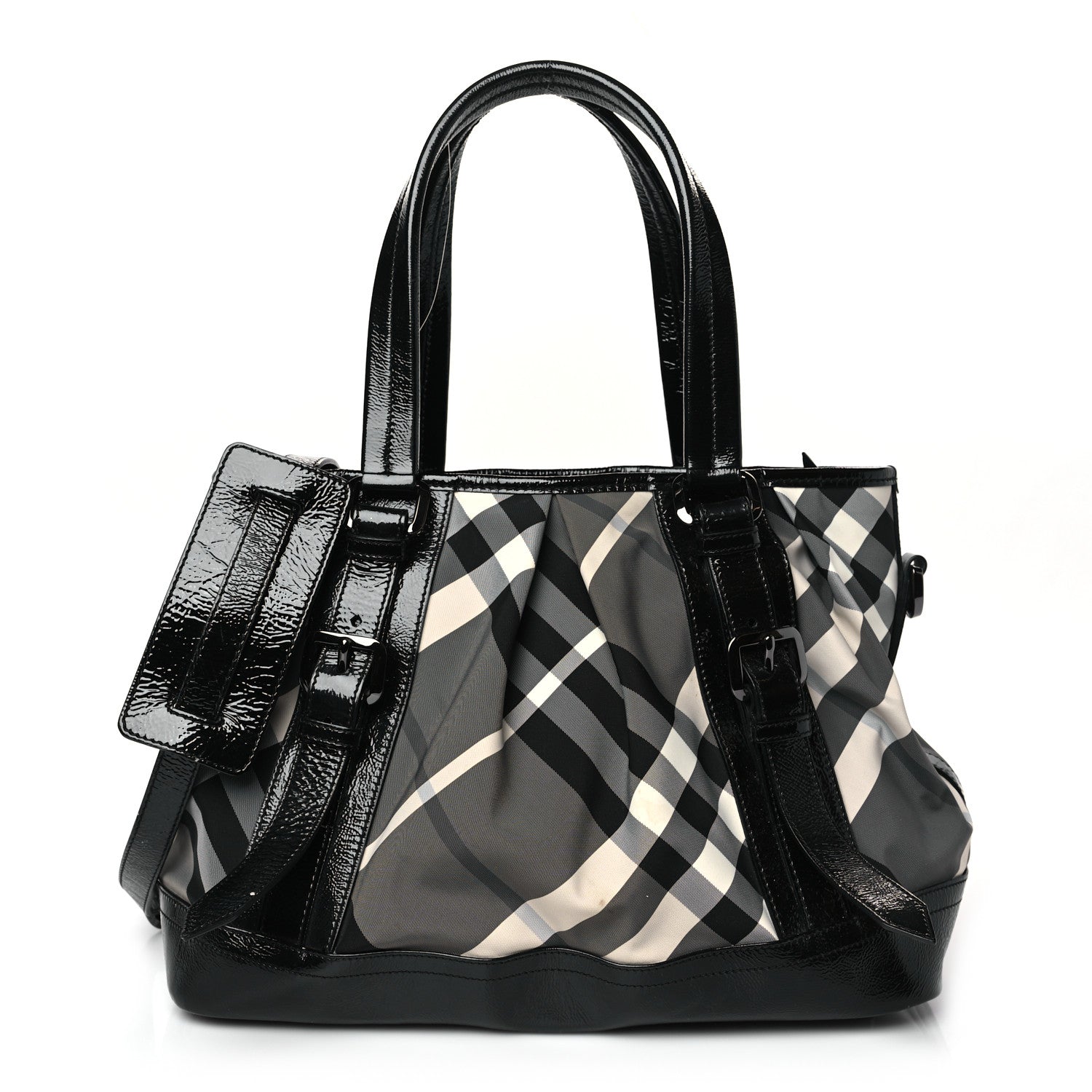 - Handles: Double flat patent leather handles and adjustable, detachable patent leather shoulder strap