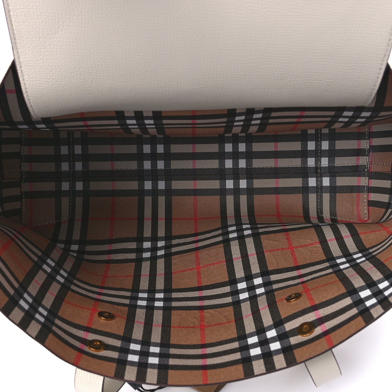 This stylish shoulder bag is crafted of white calfskin leather with a bold Burberry embossed crest. The bag features tall leather shoulder straps and a broad open top. The top is open to a check canvas interior.