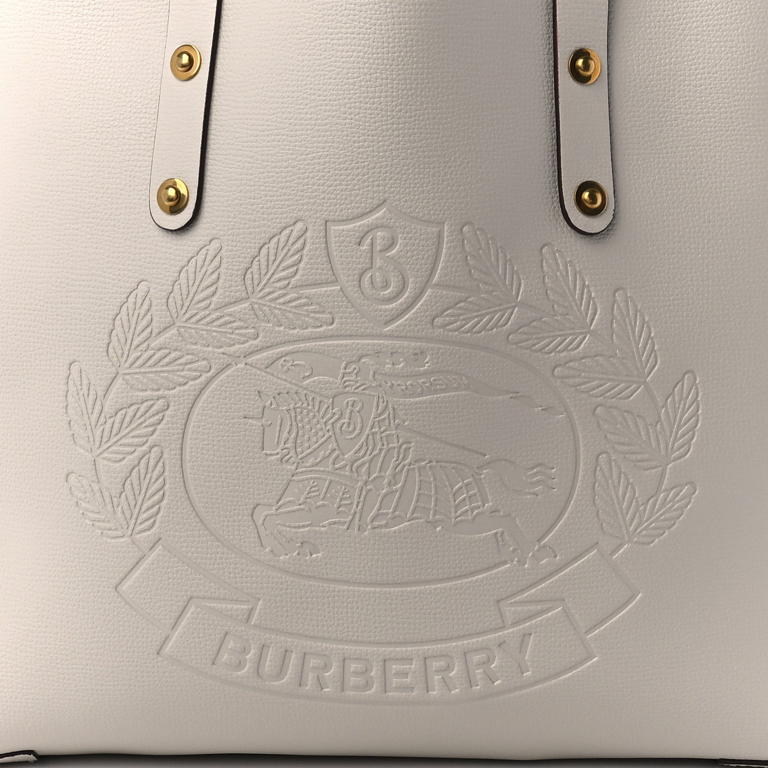 BURBERRY CALFSKIN CREST EMBOSSED SMALL TOTE BAG IN LIMESTONE