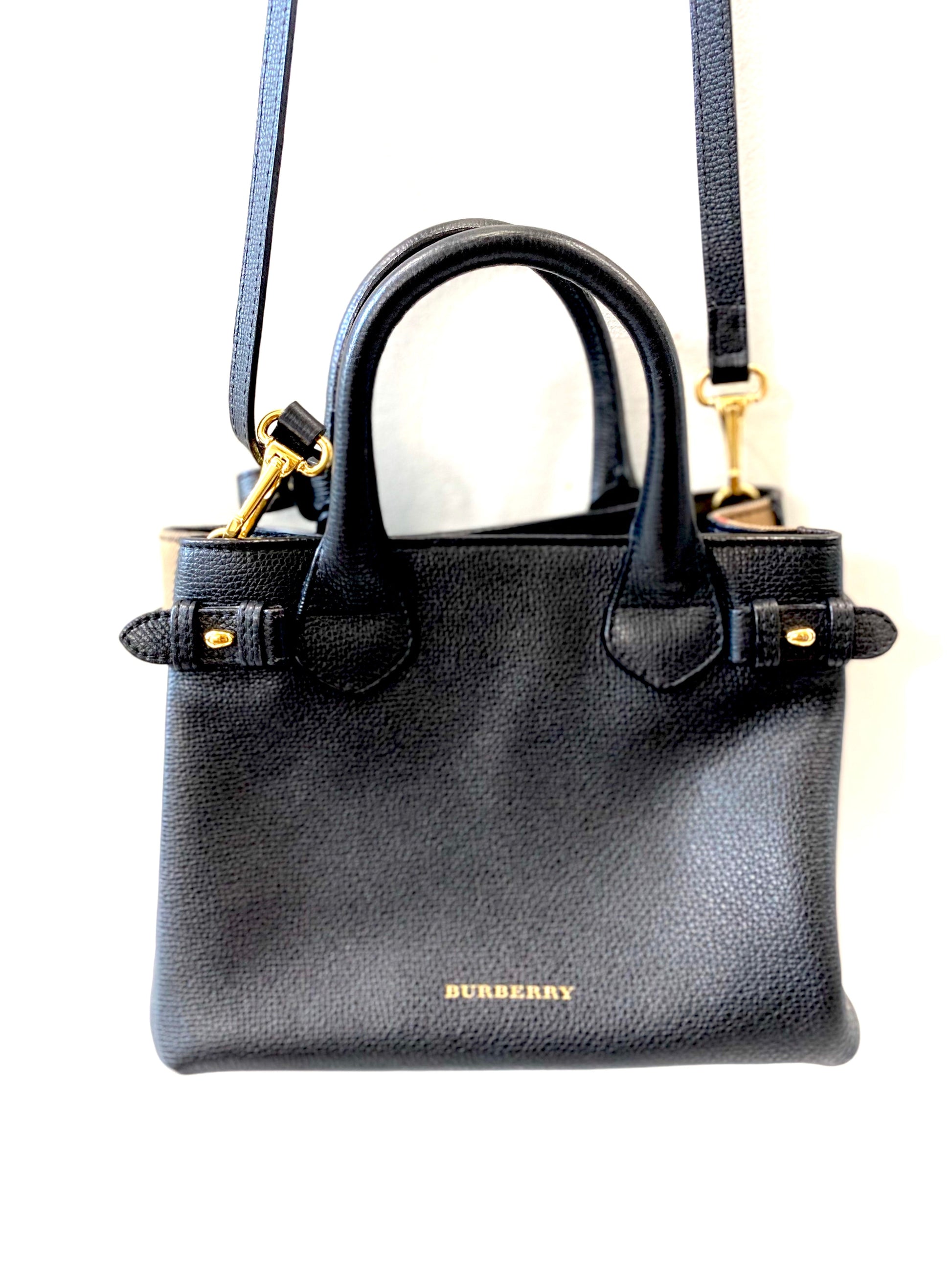 The bag features rolled leather top handles with side belts and an optional cross-body shoulder strap with brass clasps. The sides are lined with House check fabric and the top is open to a black fabric interior with zipper and patch pockets.