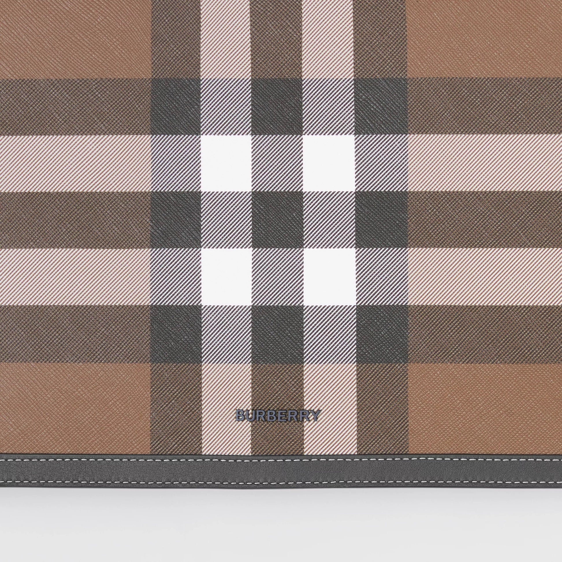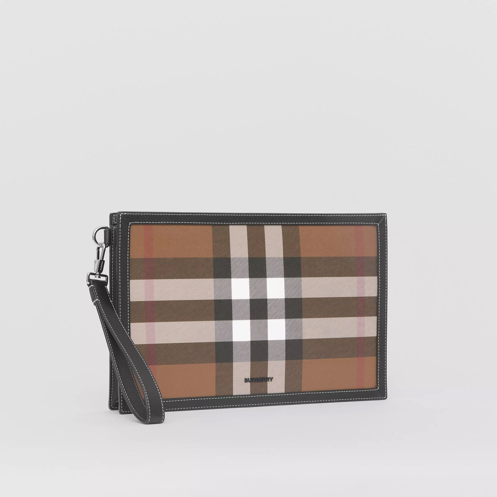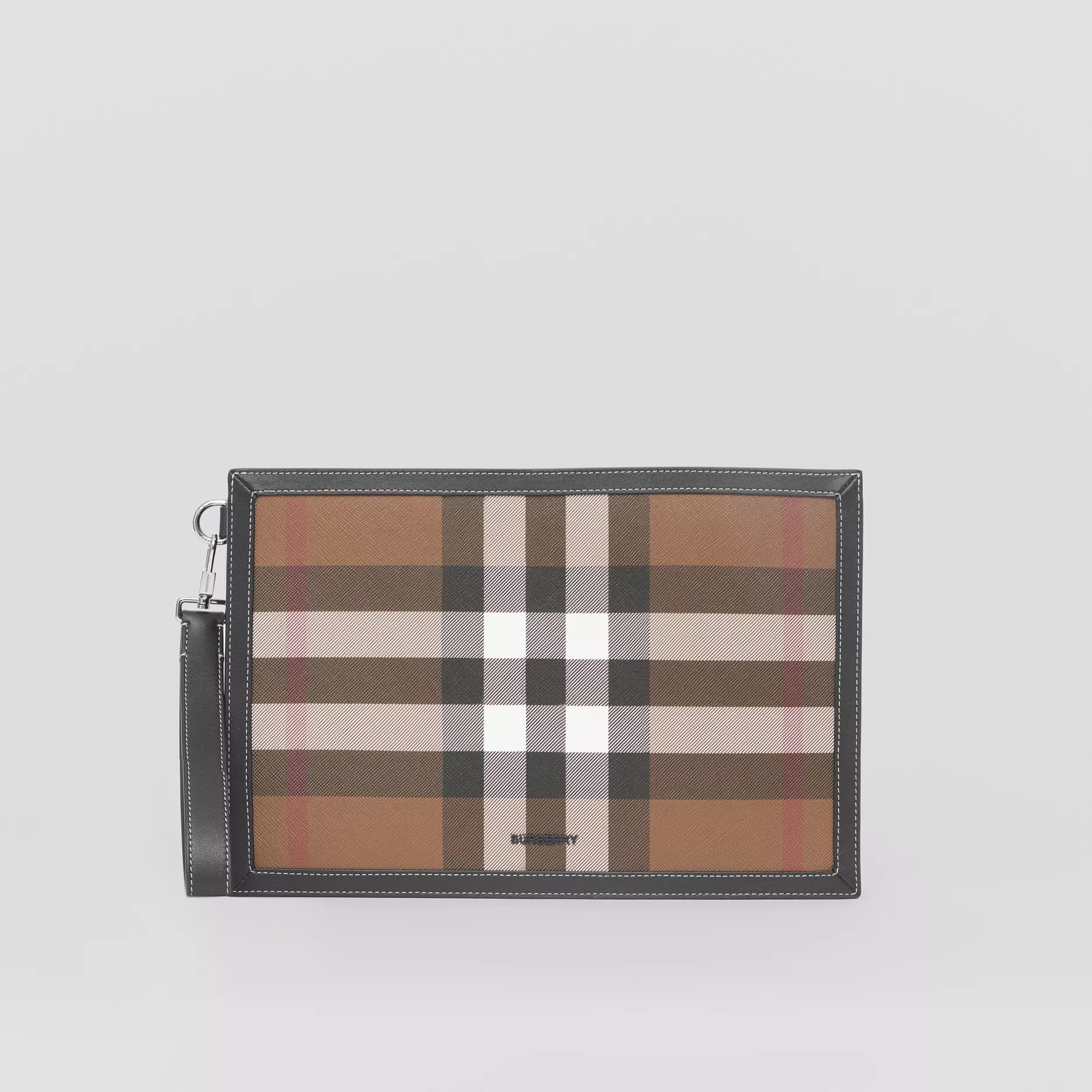 A structured check pouch framed with topstitched leather, highlighted with a logo detail and detachable wrist strap.