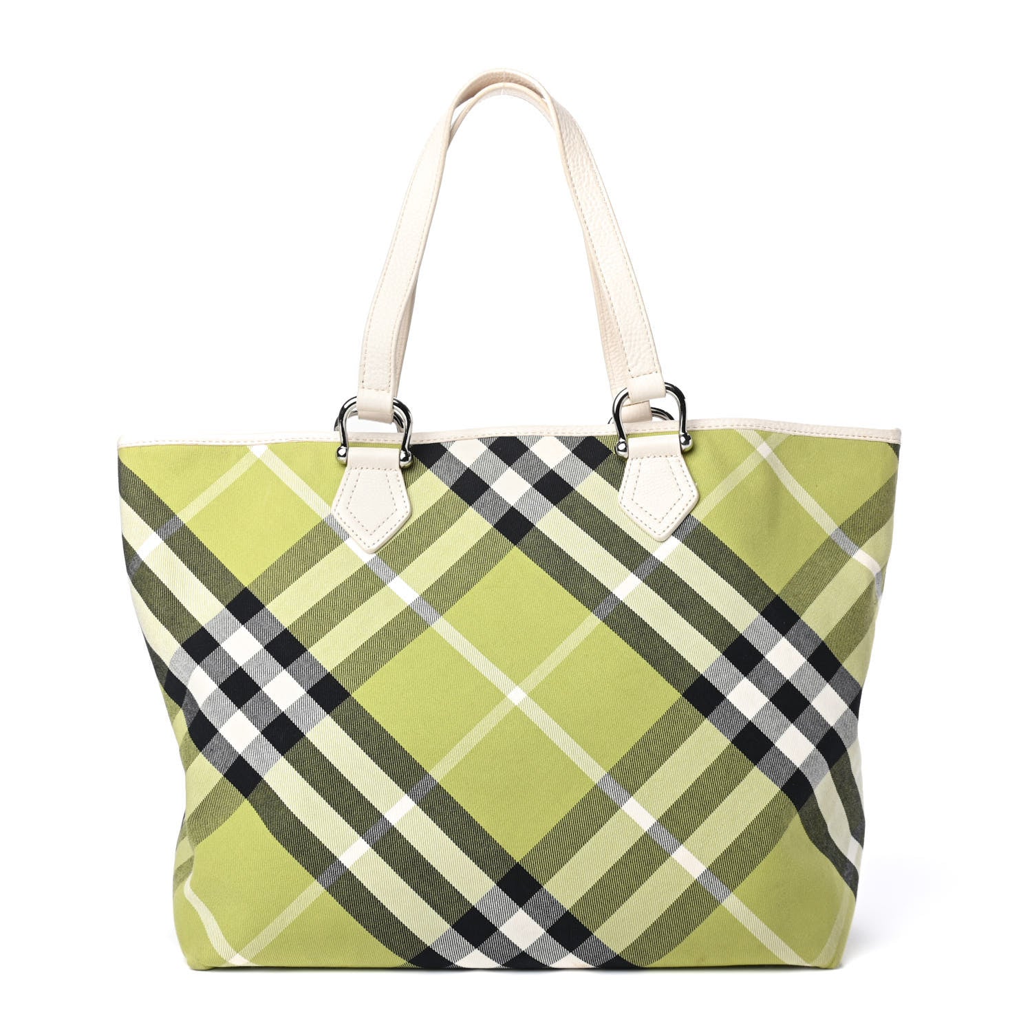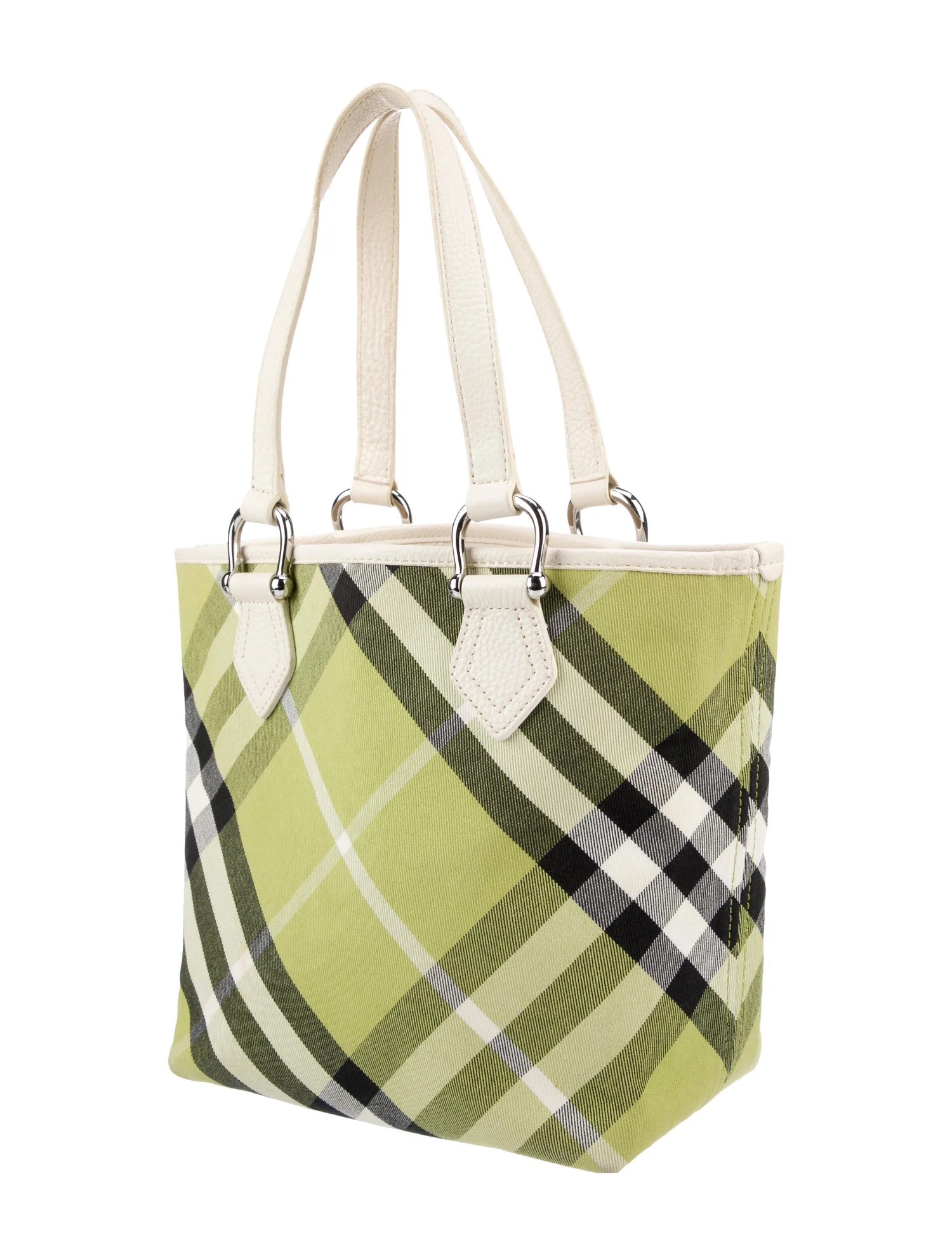 This Chic Tote is Crafted of classic Burberry Nova large check canvas. The bag features tall white leather top handles with polished silver rings and a top crest trim of white leather. The broad top opens to a spacious sand fabric interior.