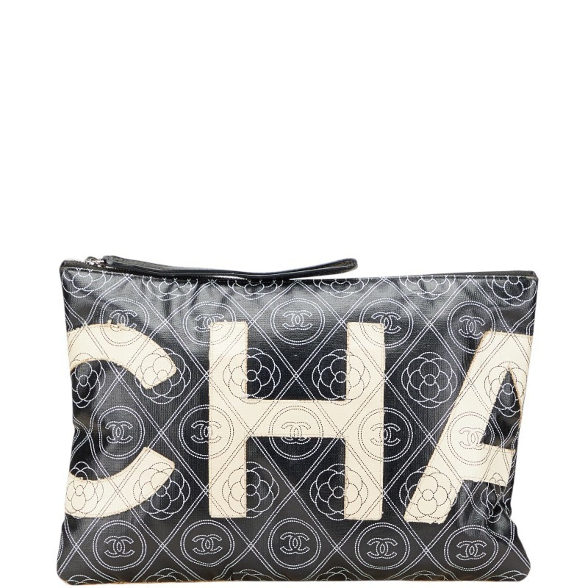 Chanel Camellia Beige Black Pvc Clutch Bag