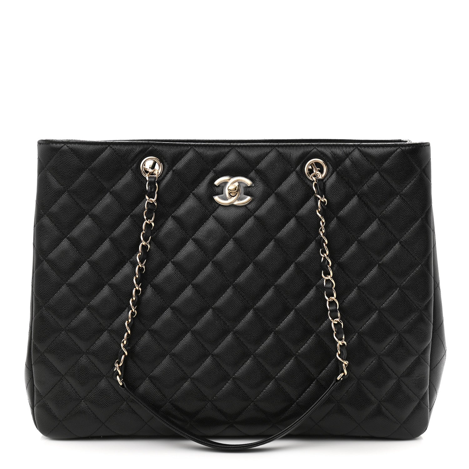 This Timeless tote bag is made of black Caviar Calfskin with gold-tone hardware; features the CC signature clasp, rear exterior slip pocket, and interwoven gold tone chain link, and black leather shoulder straps.
