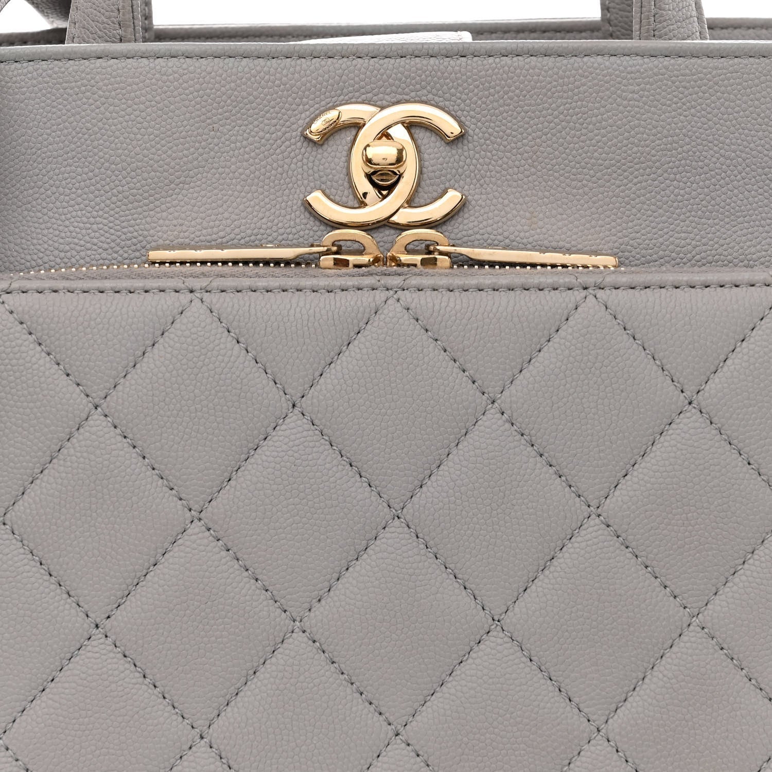This Stunning Tote is beautifully crafted of caviar leather in grey. The bag features rolled top handles, a front zipper pocket, a leather threaded gold chain link shoulder strap with shoulder pad, expandable sides, and a gold Chanel CC turn lock. The top opens to a very spacious grey fabric interior with zipper and patch pockets.