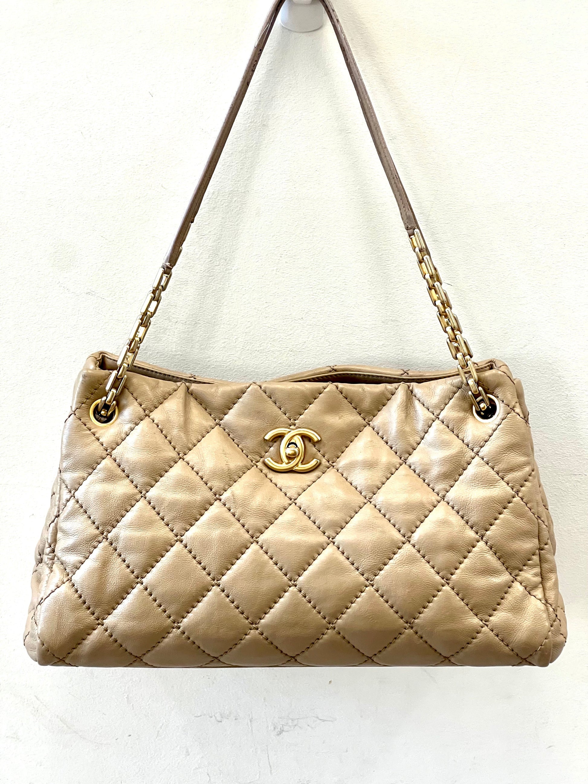 Crafted in Beige quilted calfskin leather, features dual leather handles with chain links, protective base studs, and gold-tone hardware. Its CC turn-lock and zip closure opens to a beige fabric interior with slip pocket.