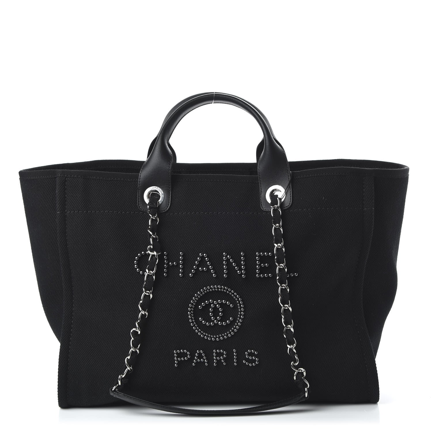 Crafted of fabric in black with a dark silver beaded Chanel advertisement logo. It features black leather top handles and a fabric threaded polished ruthenium chain link shoulder straps. The top is open to a black interior with zipper and patch pockets.