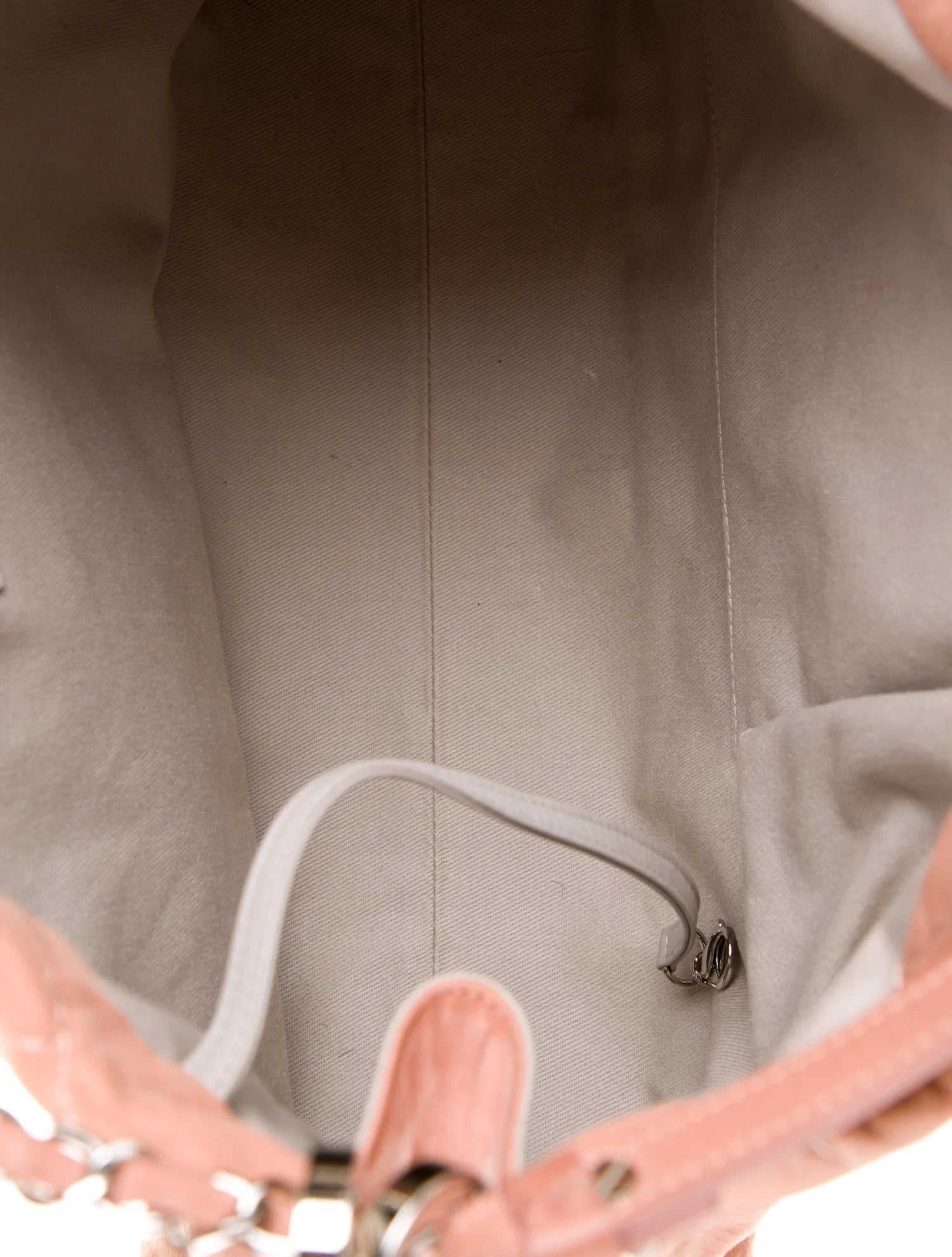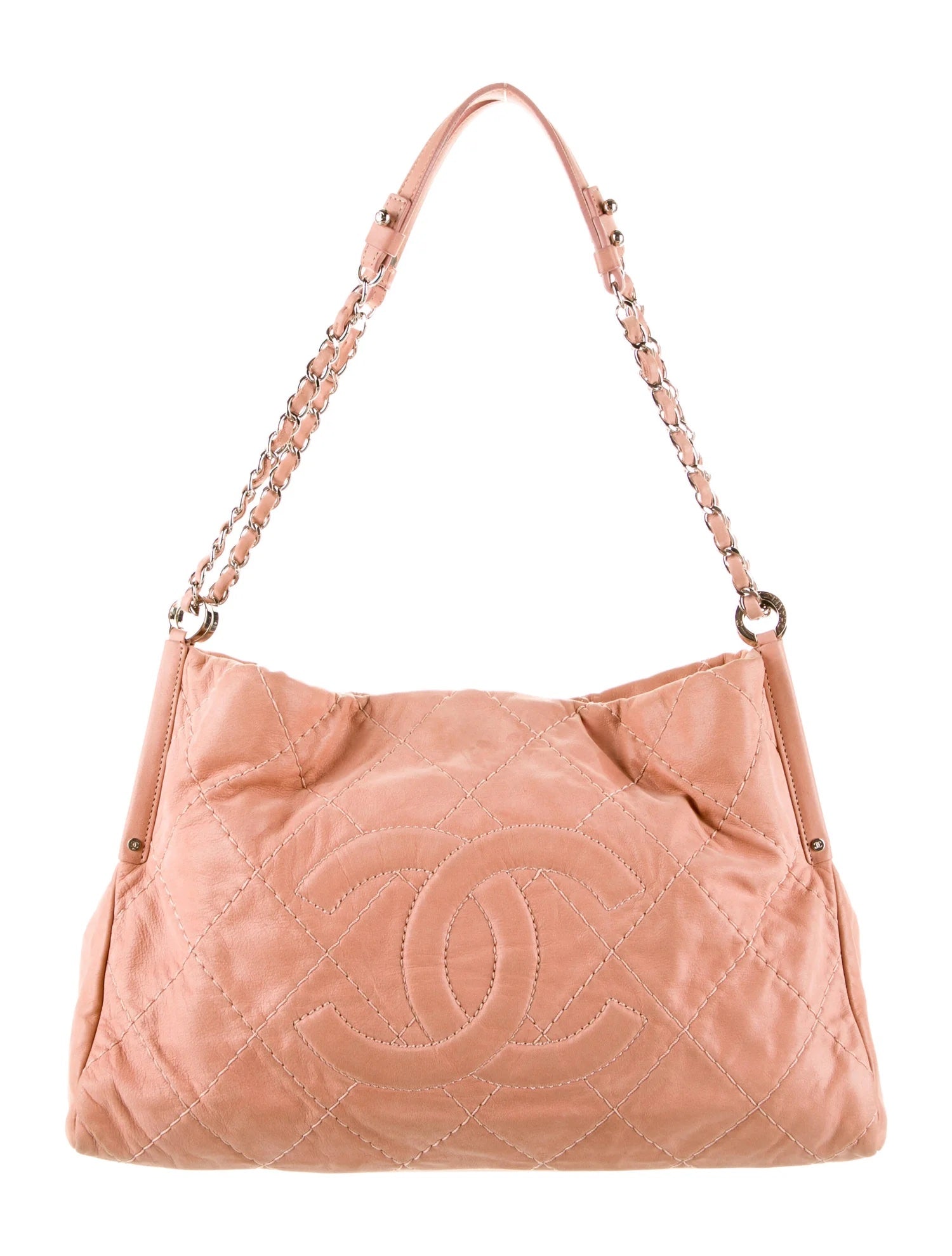The Chanel Pink Quilted Iridescent Calfskin Leather Sea Hit Large Tote Bag from Spring 2012 features an East/west tote style, with iridescent calfskin leather that creates a unique shiny effect in the classic Chanel Diamond quilting pattern.