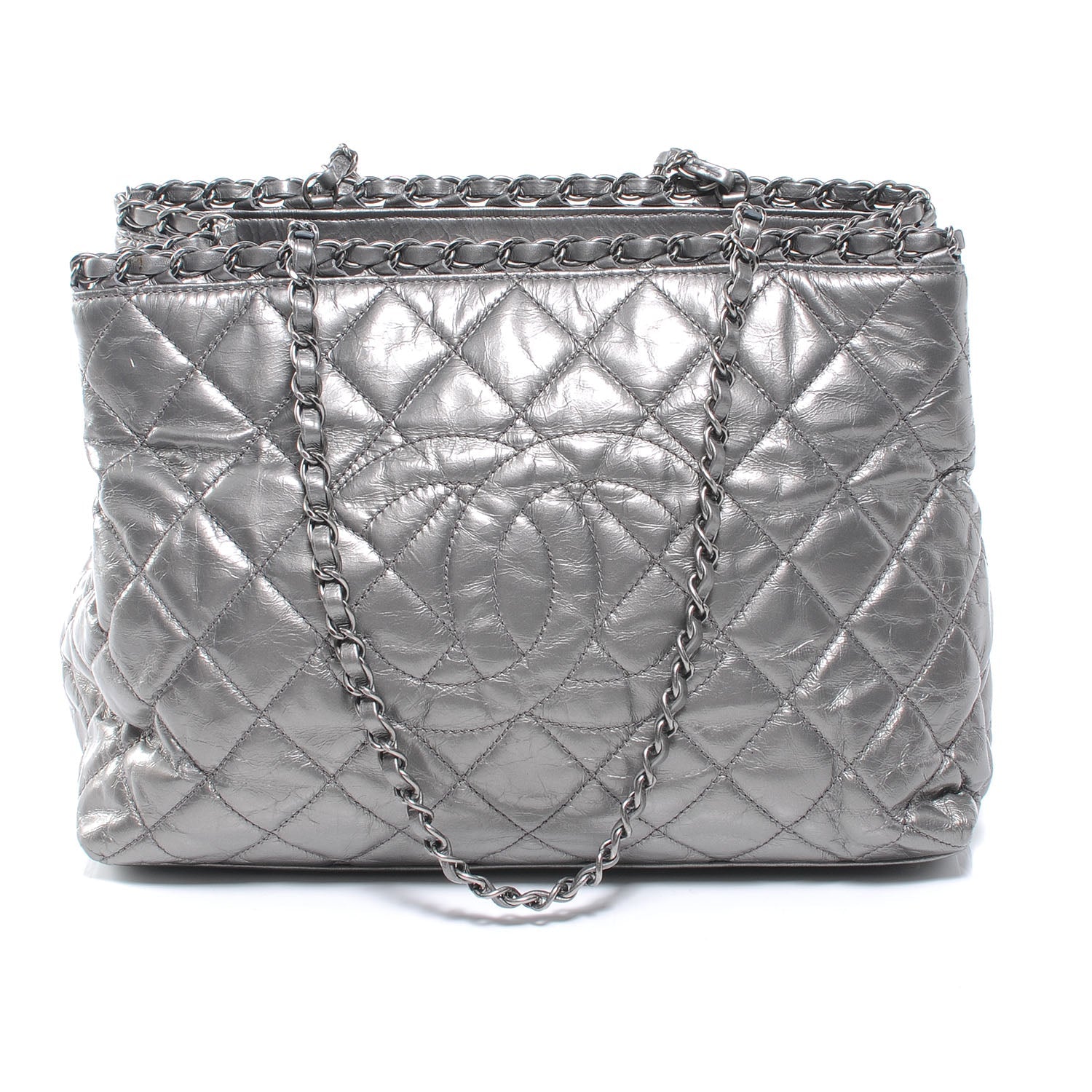 This Stunning Chanel Silver-Pewter Quilted Timeless Chain Around Grand Shopping Tote GST Bag is stunning and yet subtle with Pewter distressed textured calfskin and woven double chain, with a finishing touch of the chain around the top rim of the tote.