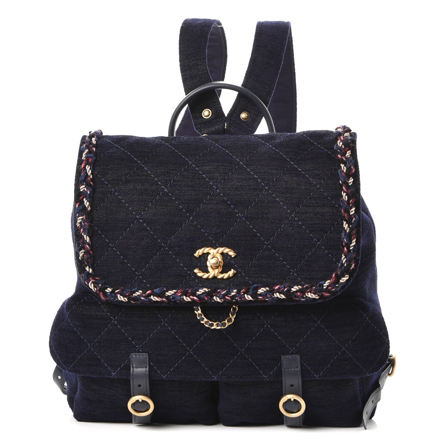 Features a Blue leather top handle, adjustable back straps, and multicolor tweed trim on the diamond stitched front flap that opens with an aged gold Chanel CC turn lock closure and a CC cinch cord pull.