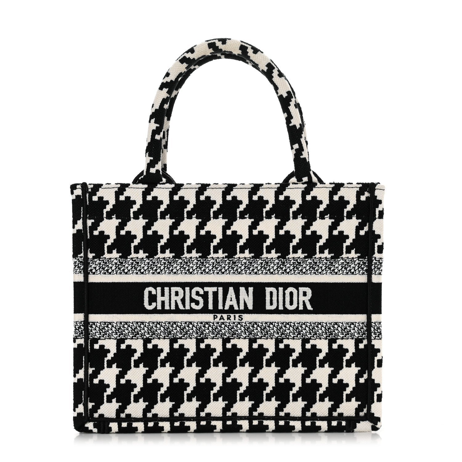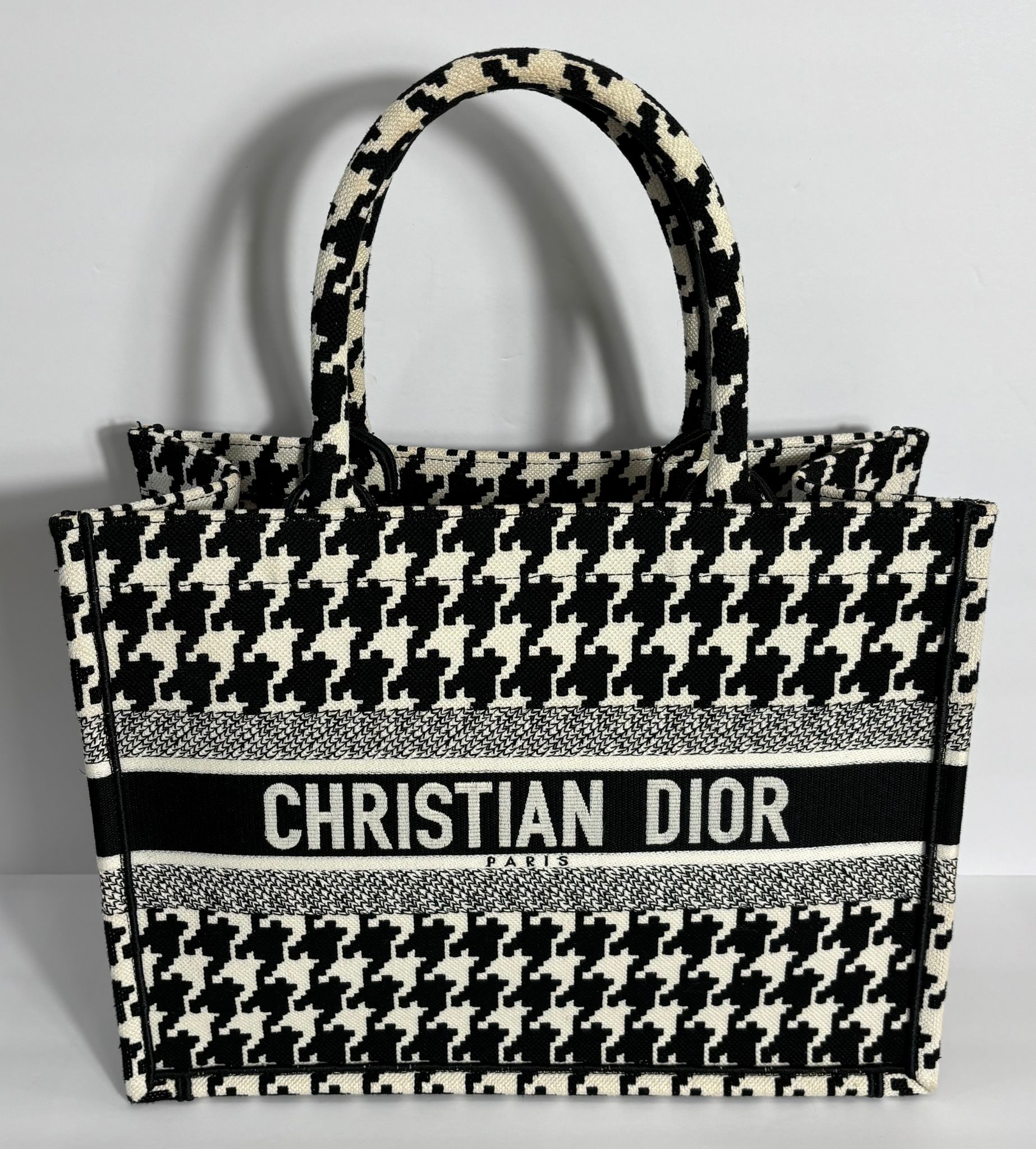 Make a bold statement with this finely crafted tote, featuring an eye-catching houndstooth pattern on embroidered canvas. Designed with matching canvas handles, this iconic piece is finished with the CHRISTIAN DIOR logo prominently embroidered across the front. The tote opens to a spacious, unlined fabric interior—perfect for carrying your essentials in effortless style.