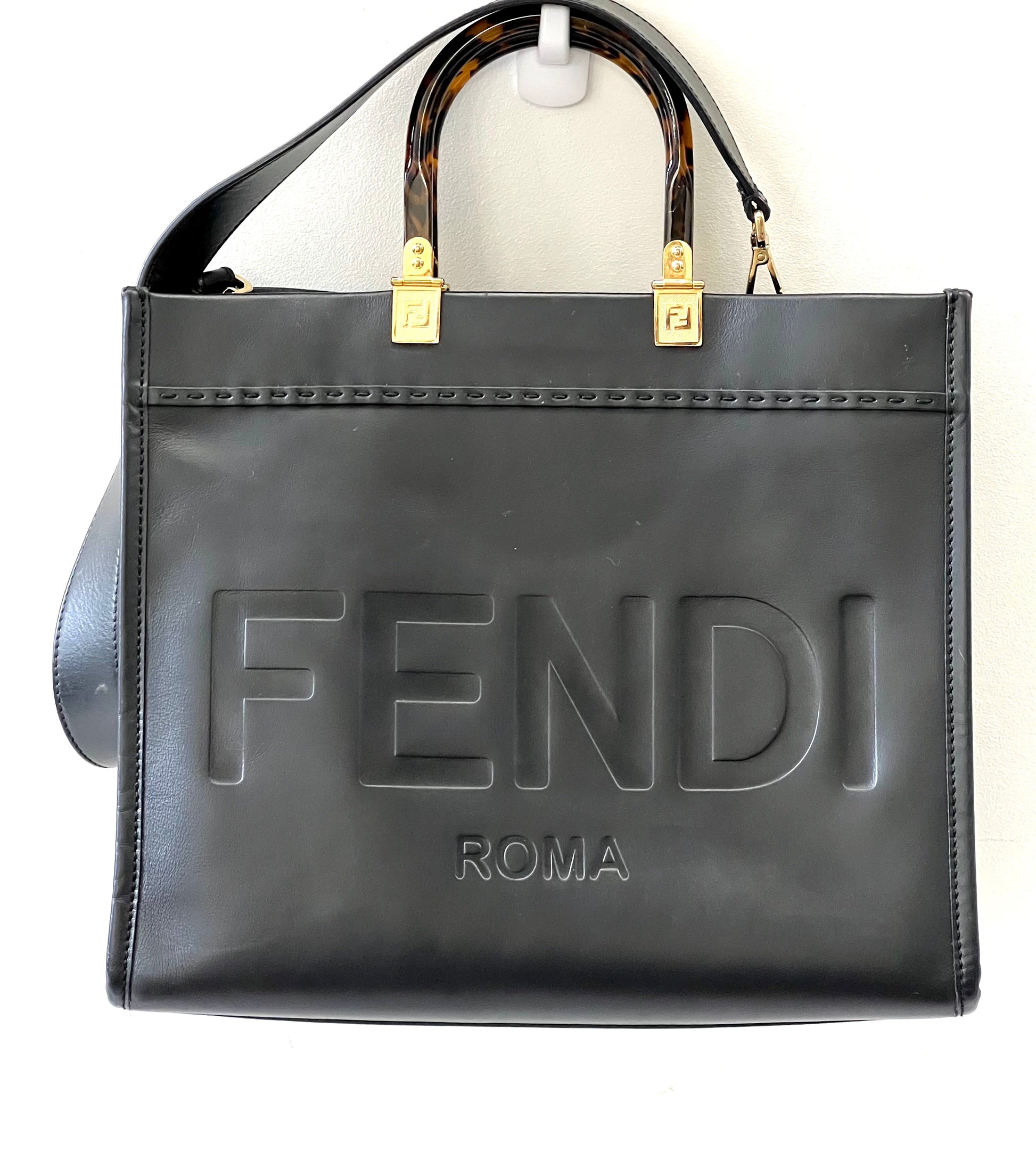 “FENDI ROMA” and stiff tortoiseshell plexiglass handles.