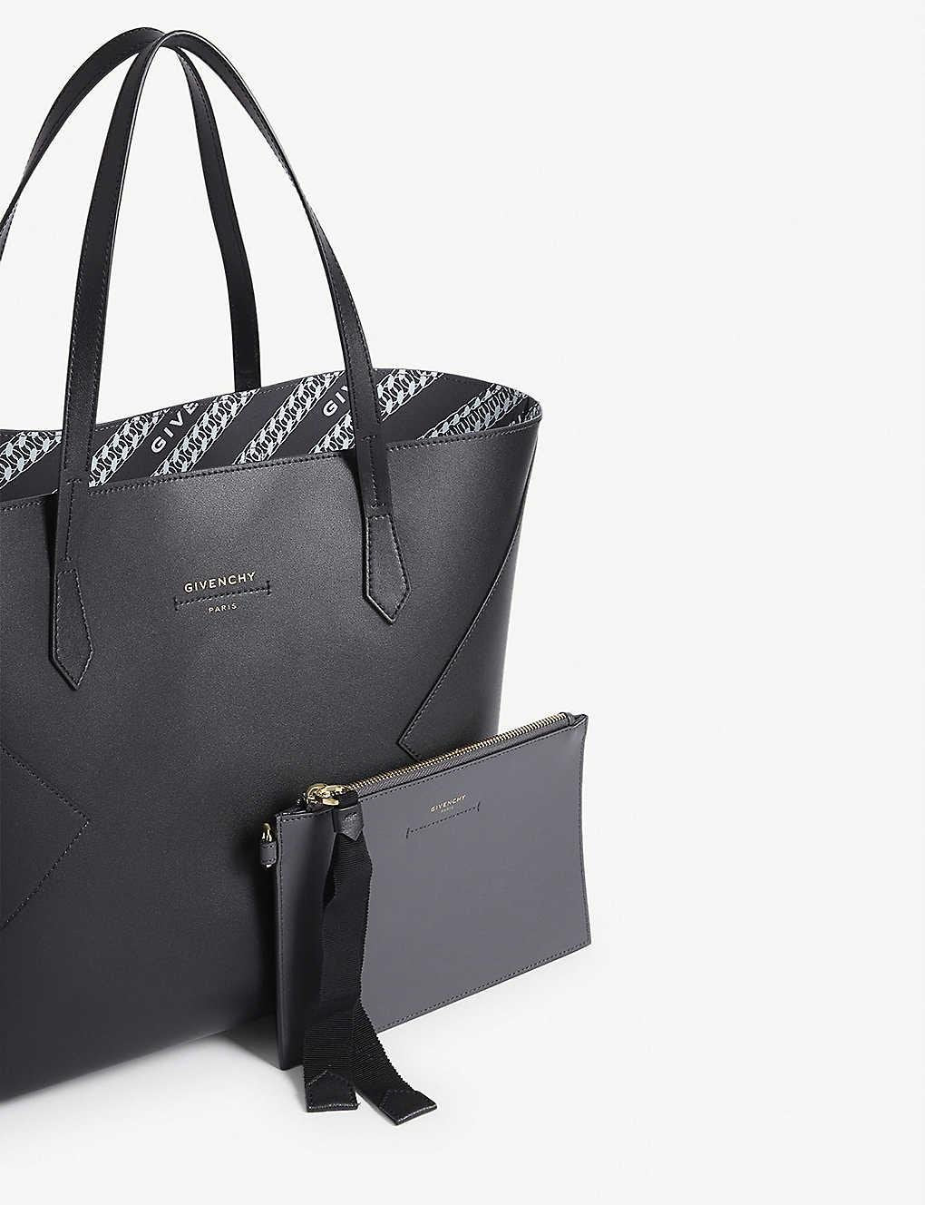 Leather tote bag featuring contrasting GIVENCHY Chaîne logo lining, leather handles, and single inner compartment.