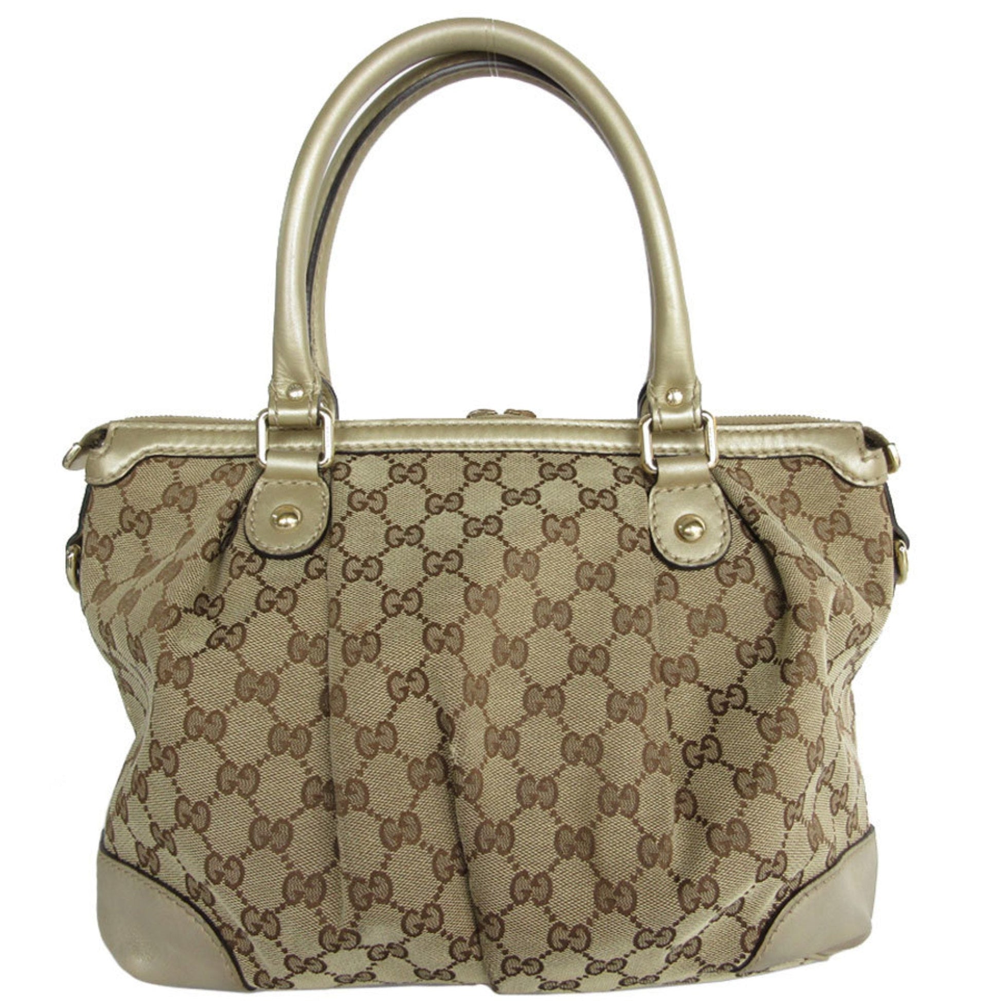 Brand: Gucci, Color: Beige, Gold, Material: Canvas, Leather, Dimensions: 25cm x 32cm x 13cm / 9.84'' x 12.59'' x 5.11'', Condition: Rank AB. Rank AB Used - Traces of usage, scratches / dirt can be seen but generally in good condition. Before purchasing, please refer to the images for the exact condition of the item. Before purchasing, please refer to the images of the accessories included with the item. Damage Ranking: Slight