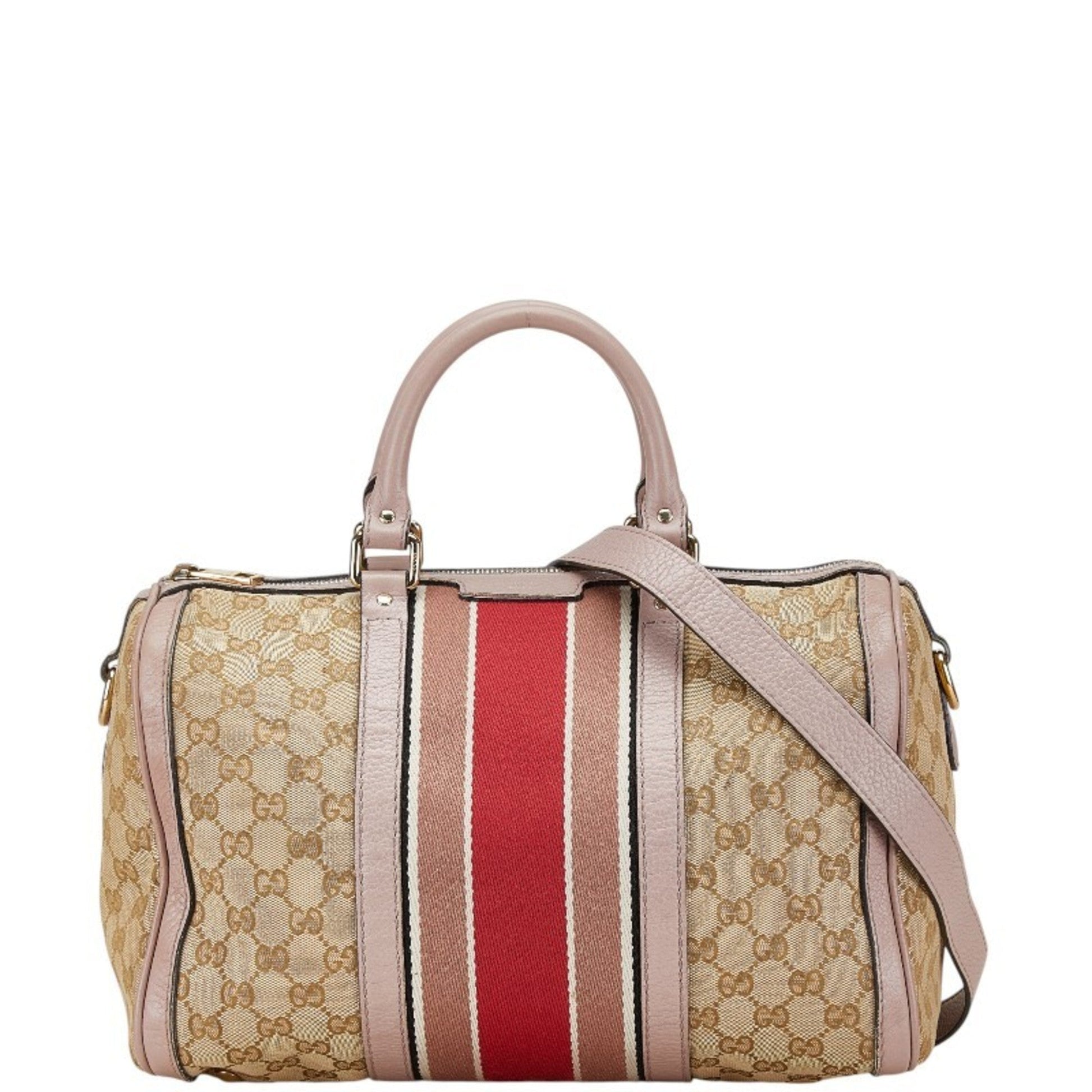 Brand: Gucci, Color: Beige, Pink, Material: Canvas, Leather, Dimensions: 21.5cm x 34cm x 16cm / 8.46'' x 13.38'' x 6.29'', Condition: Rank B. Rank B Used - Traces of usage, damages / dirt can be seen but it is still in acceptable condition for continued usage. Before purchasing, please refer to the images for the exact condition of the item. Before purchasing, please refer to the images of the accessories included with the item. Damage Ranking: Moderate