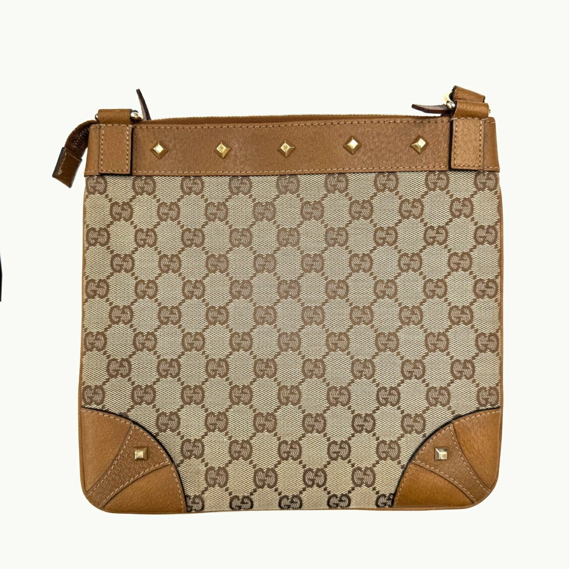 Brand: Gucci, Color: Brown, Material: Canvas, Leather, Dimensions: 30cm x 26cm x 1cm / 11.81'' x 10.23'' x 0.39'', Condition: Rank AB. Rank AB Used - Traces of usage, scratches / dirt can be seen but generally in good condition. Before purchasing, please refer to the images for the exact condition of the item. Before purchasing, please refer to the images of the accessories included with the item. Bag Common Damage Scratch: Slight