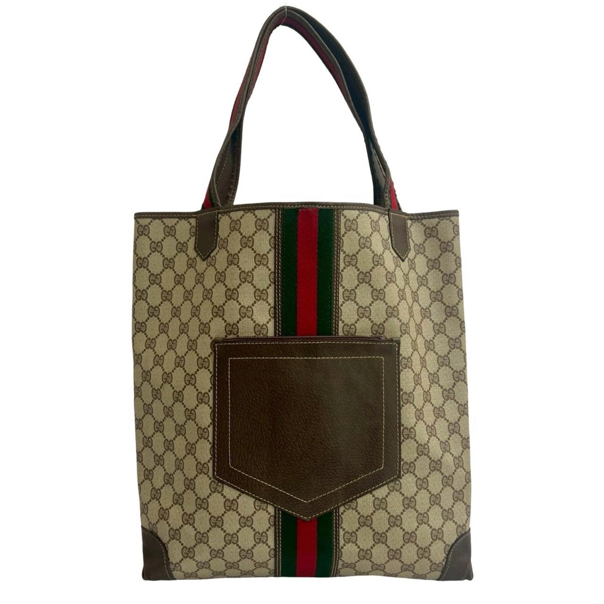 Brand: Gucci, Color: Brown, Green, Red color, Material: Leather, PVC, Dimensions: 33.5cm x 38cm x 8cm / 13.18'' x 14.96'' x 3.14'', Condition: Rank AB. Rank AB Used - Traces of usage, scratches / dirt can be seen but generally in good condition. Before purchasing, please refer to the images for the exact condition of the item. Before purchasing, please refer to the images of the accessories included with the item. Bag Common Damage Scratch: Slight