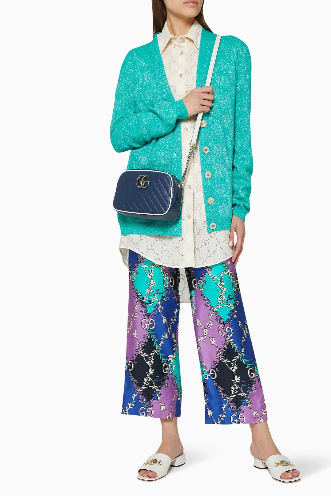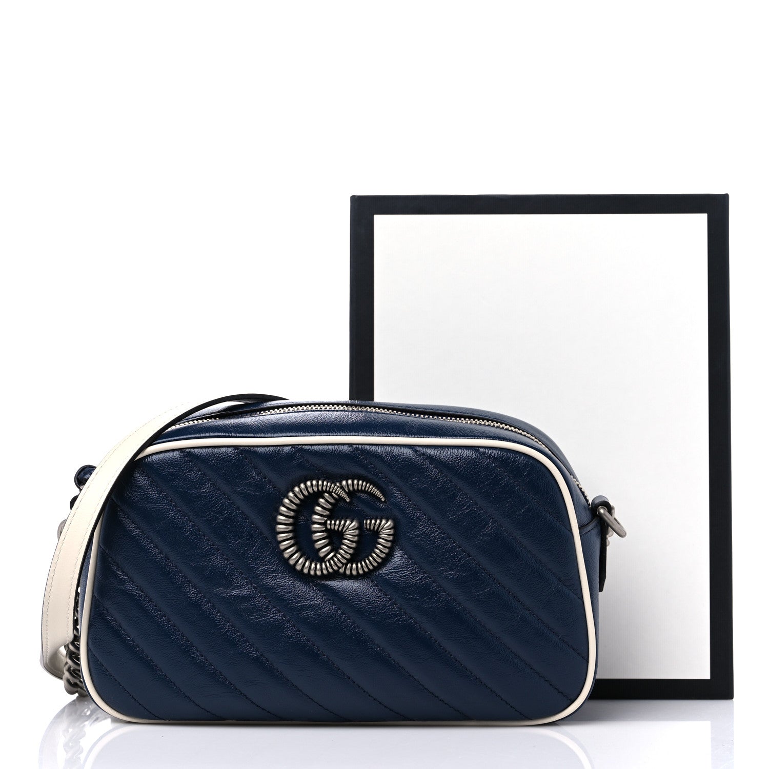 Crafted of Glazed Vintage Effect Calfskin Leather in dark blue, with white leather trim, an aged silver chain shoulder strap, and a silver GG logo on the front. Height 5.5", Width 9.5", Depth 2.5"