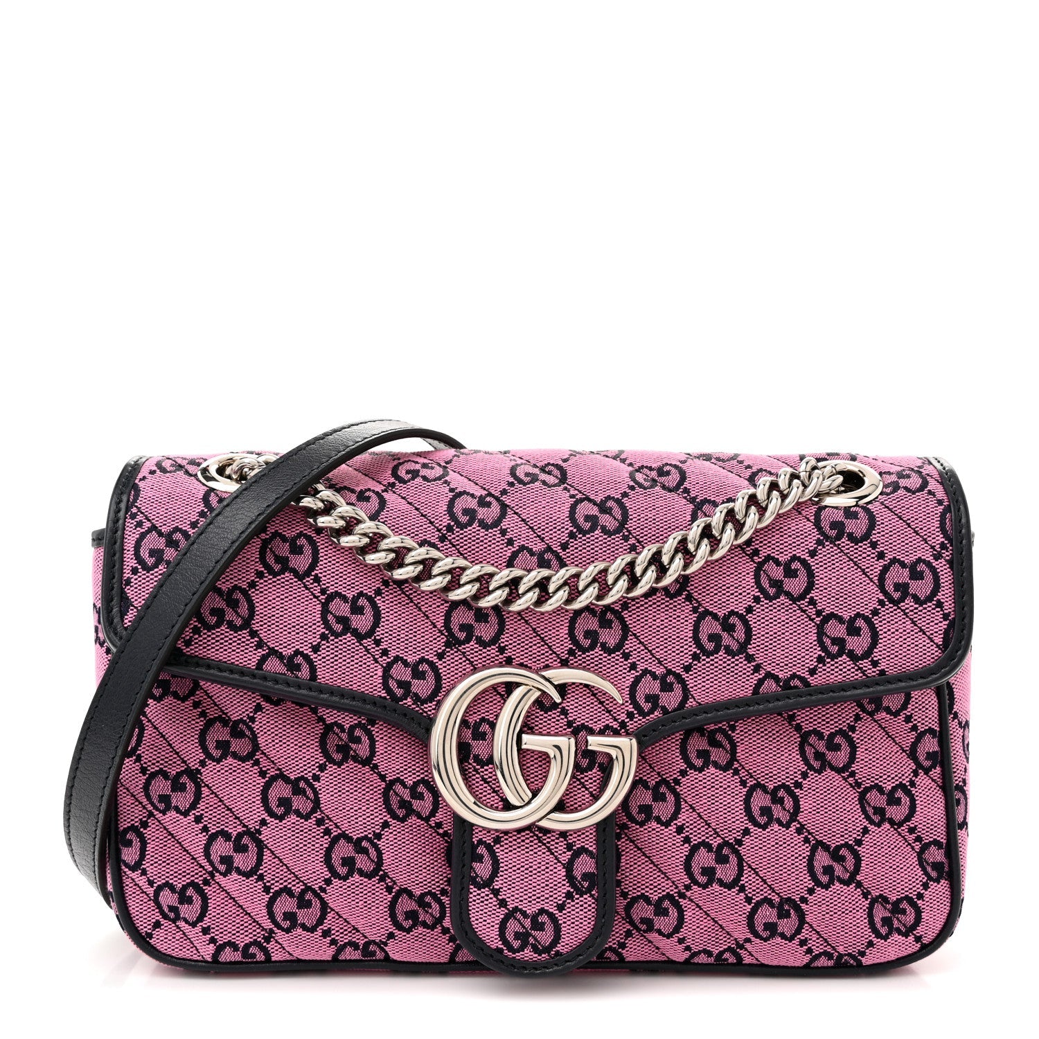This stunning Gucci GG Marmont Small Shoulder Bag is crafted in pink diagonal quilted canvas with navy blue leather trim for a bold and stylish contrast. The design features a silver chain-link shoulder strap with a blue leather shoulder pad for comfortable wear. The front flap is adorned with Gucci’s iconic interlocking GG logo in silver and secures with a press-lock closure. Inside, the beige fabric-lined interior offers a zipper pocket to keep your essentials organized. A timeless piece with modern flair, this versatile bag transitions seamlessly from day to night, season after season.