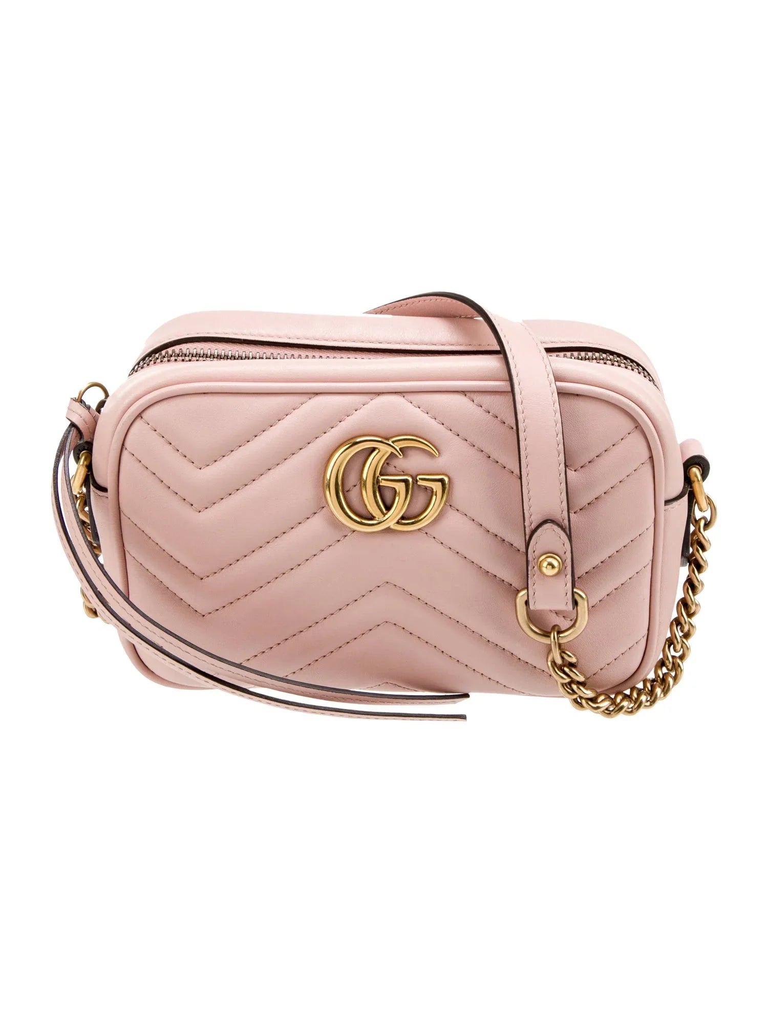 Designed under the creative direction of Alessandro Michele, this chic Gucci crossbody bag is crafted from soft pink leather with signature chevron quilting. The iconic Double G logo in gold-tone hardware adds a timeless touch, while chain-link accents and a coordinating shoulder strap bring effortless elegance. The zip-top closure opens to a plush suede-lined interior with a single pocket—perfect for storing your daily essentials in style.