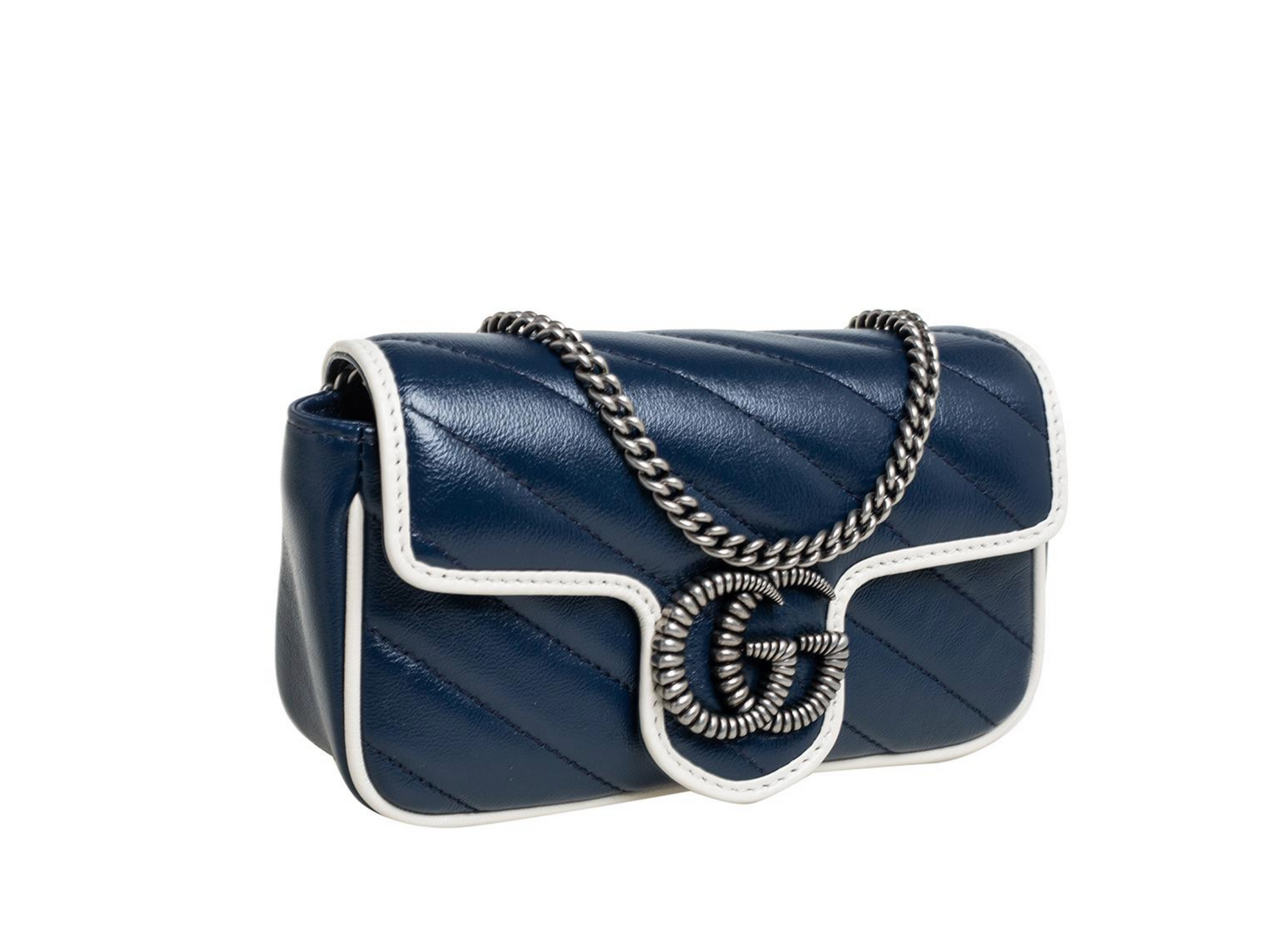 Gucci Navy Diagonal Matelasse Vintage Effect Calfskin Super Mini Torchon GG Marmont Silver Hardware.