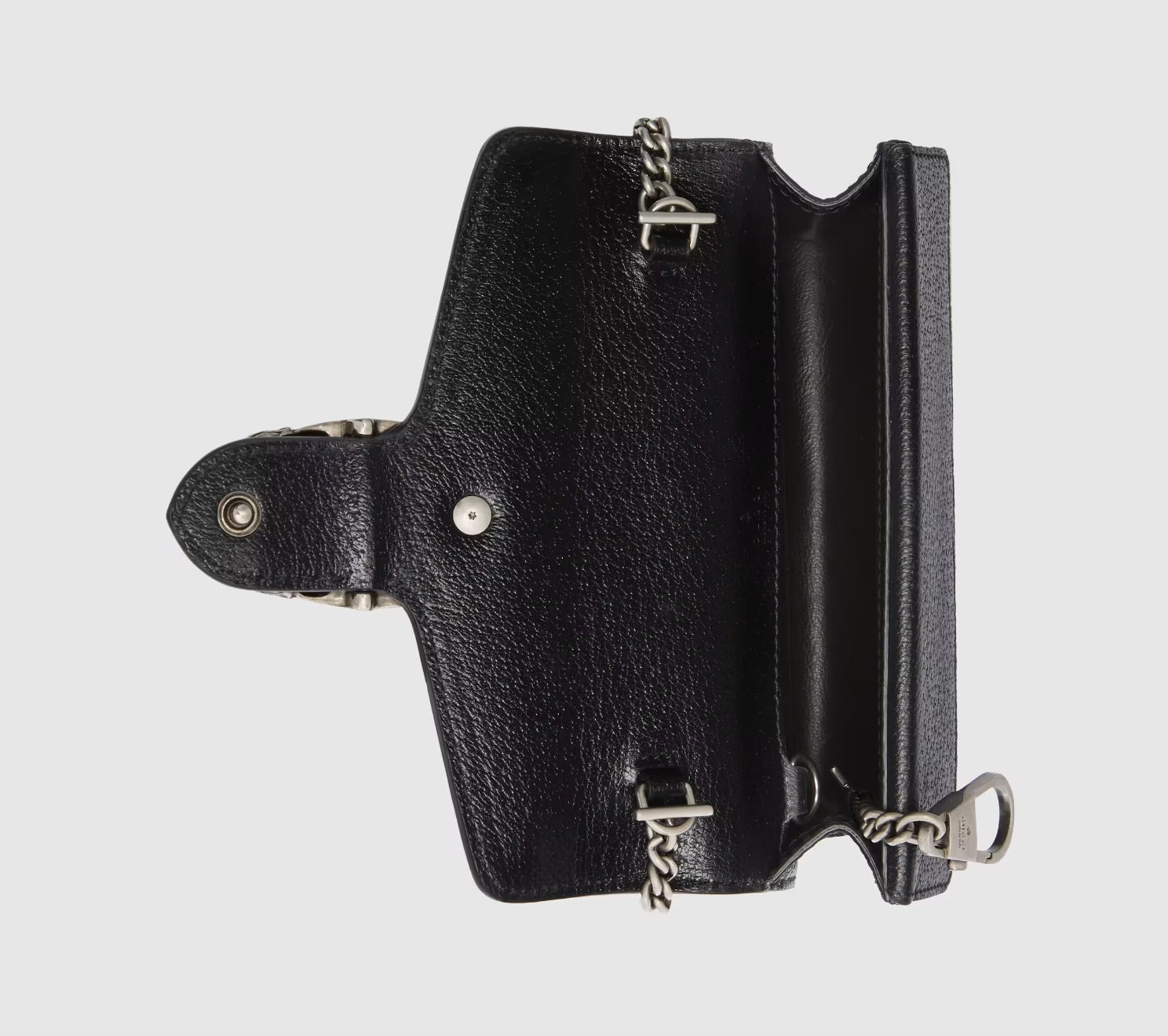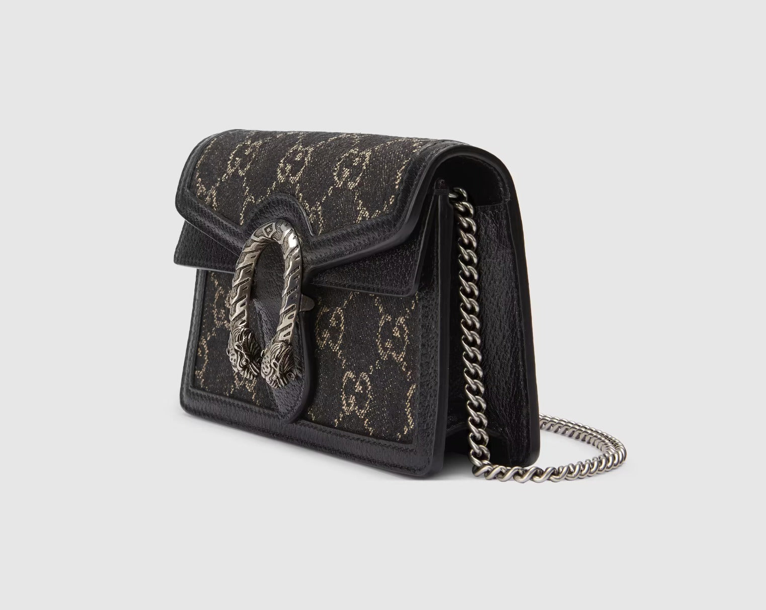 A structured GG Supreme canvas chain super mini shoulder bag with a key ring that can be used to attach this bag to a separate larger bag. The closure has the textured tiger head spur closure-a unique detail referencing the Greek god Dionysus, who in myth is said to have crossed the river Tigris on a tiger sent to him by Zeus. The accessory can also be worn as a crossbody bag.
