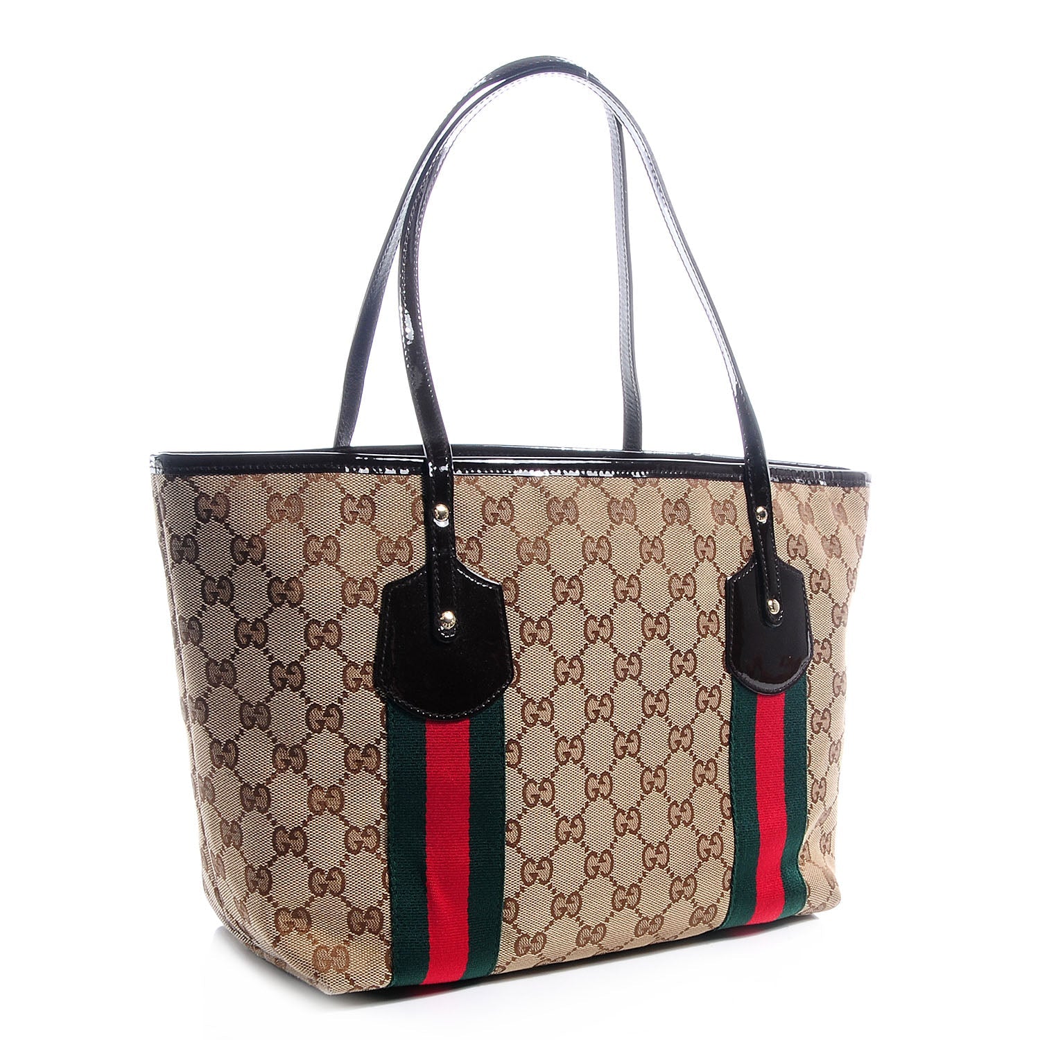 Crafted of classic brown on beige Gucci GG monogram canvas with a classic red and green stripe. The bag features thin and durable leather strap handles, nylon stripe details, and hanging Gucci GG charms. The top is open to a jacquard weave Gucci logo fabric interior with zipper and patch pockets.