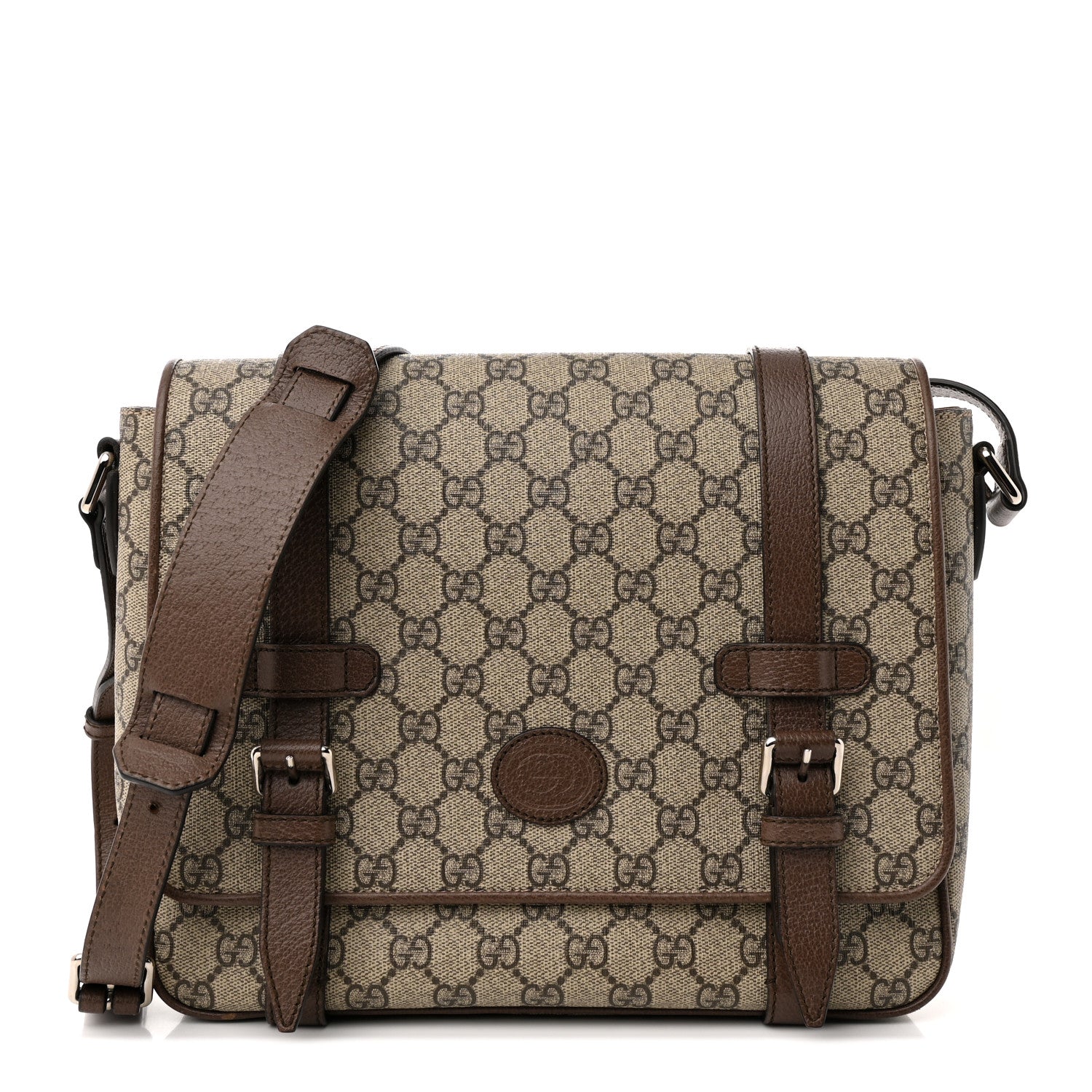 Elevate your everyday style with this timeless Gucci GG Supreme Messenger Bag. Crafted from Gucci’s signature beige GG Supreme canvas, this bag offers both durability and a refined aesthetic. The iconic interlocking GG pattern is complemented by dark brown leather trim and a stylish, adjustable canvas strap in classic beige and green tones, providing comfort and versatility. Perfect for professionals or students, this spacious messenger bag features a flap closure and a roomy interior, making it ideal for carrying essentials with ease.