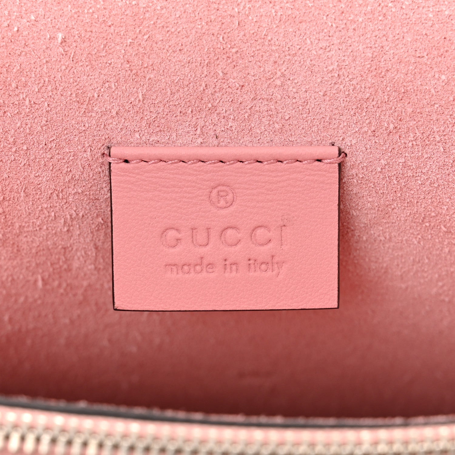 This stylish bag is crafted of Gucci GG monogram coated canvas with light pink suede accent panels. The bag features an aged silver chain strap, a textured horseshoe closure with tiger head spurs, and crystal studded trim. The front flap opens to a pink suede and coated canvas partitioned interior with a center zipper pocket.