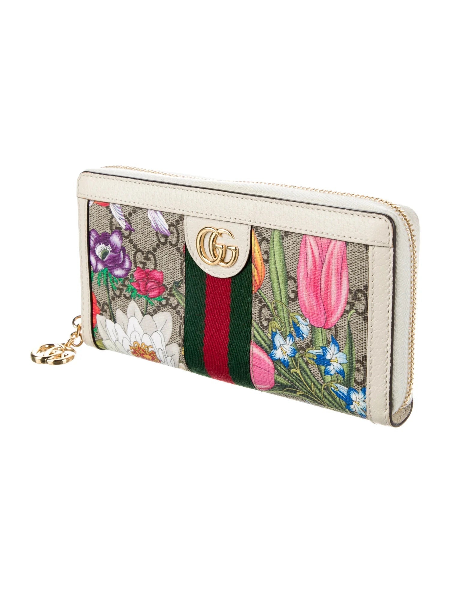 This stylish wallet is crafted of Gucci GG canvas with a floral print. The zipper opens to a leather compartmentalized interior with card slots and a zipper divider.