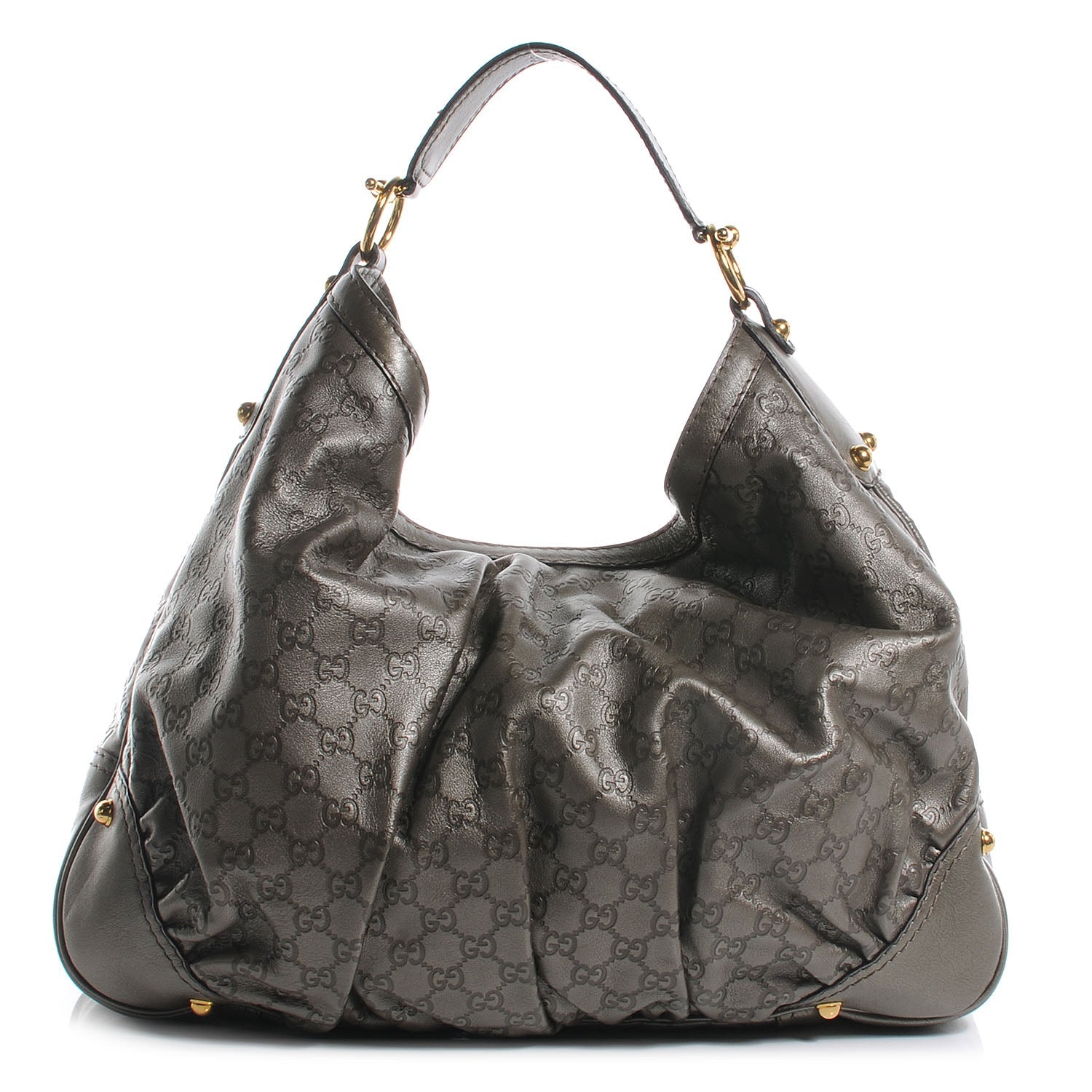 This Stylish Hobo Bag is Crafted of Gathered Gucci GG Monogram Embossed leather. The bag features smooth leather embellishments including the bottom corners, a looping shoulder strap, and links and studs of polished brass. The top unzips to a fabric interior.