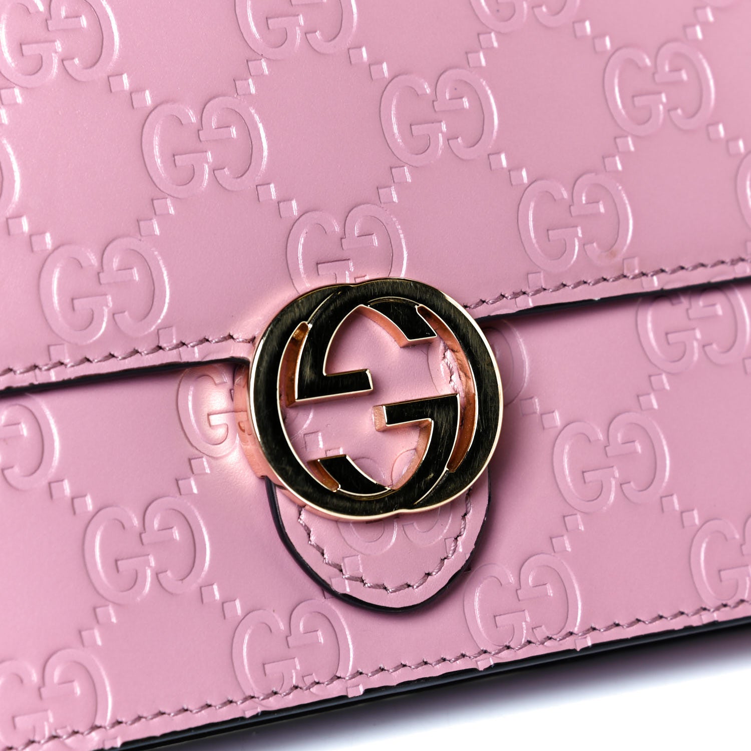 This stylish and practical wallet from the house of Gucci is designed in a gorgeous shade of pink from the brand's signature Guccissima leather. Featuring a flap silhouette, this wallet is secured with a snap-button closure and comes with the iconic 'GG' logo on the front. It opens to a neatly compartmentalized interior with ample slots for your cards and currency and a zip pocket. it is finished with gold-tone hardware and a chain-link strap.