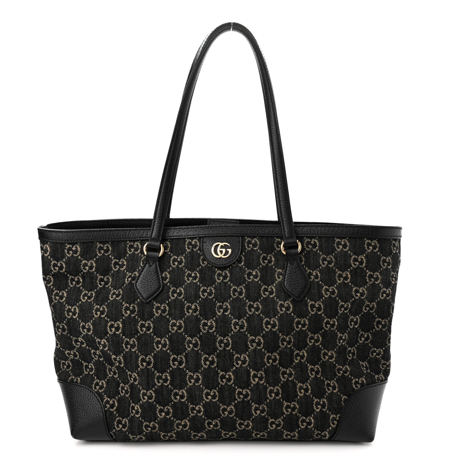 A Timeless piece from Gucci's Iconic Ophidia Line, This Medium Tote is Crafted from durable GG Monogram Denim canvas in a classic Black and beige colorway. Trimmed with smooth black leather, it features dual top handles and Gold-tone hardware, exuding refined everyday elegance.