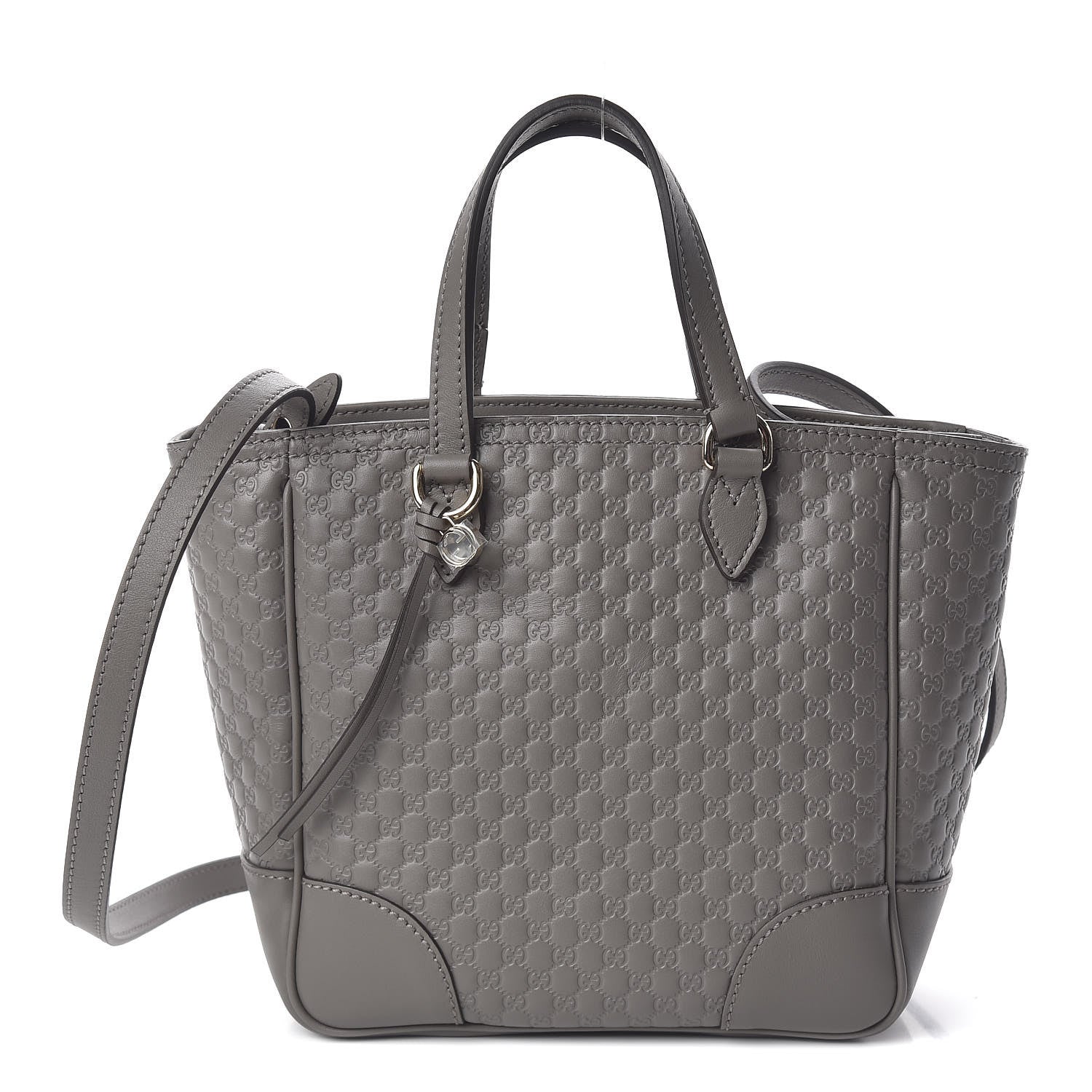 Gucci GG Logo Microguccissima gray handbag. The interior is lined in soft, durable linen and includes 2 slip pockets and 1 zipped pocket to keep you organized all day long. Complete with a cute Gucci charm.