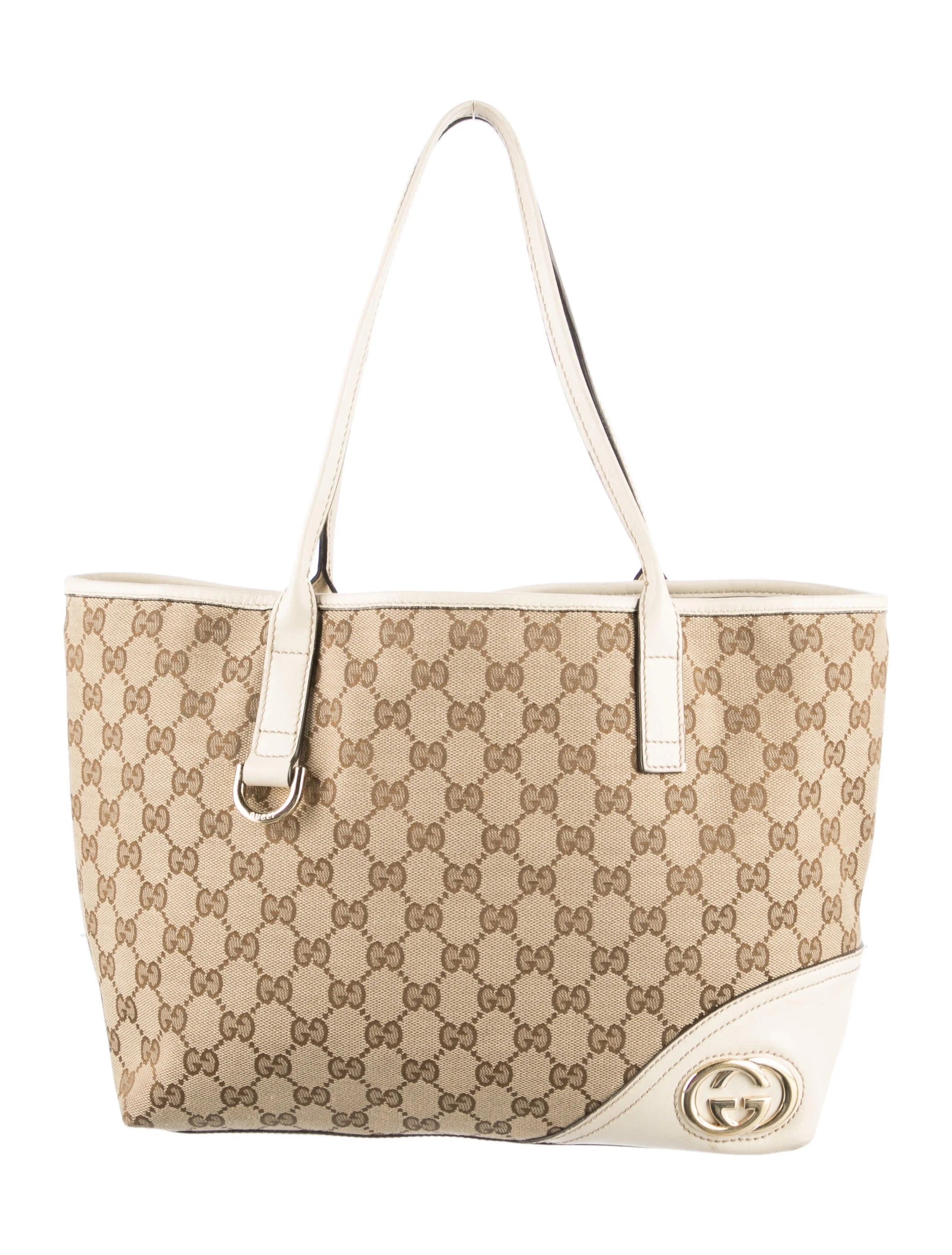 This Elegant and Functional Gucci Tote is crafted from Classic beige GG Monogram jacquard canvas. The design features tall ivory leather shoulder straps, coordinating leather trim, and reinforced bottom corners for durability and style. A structured leather base and top trim add to the bag's refined silhouette.