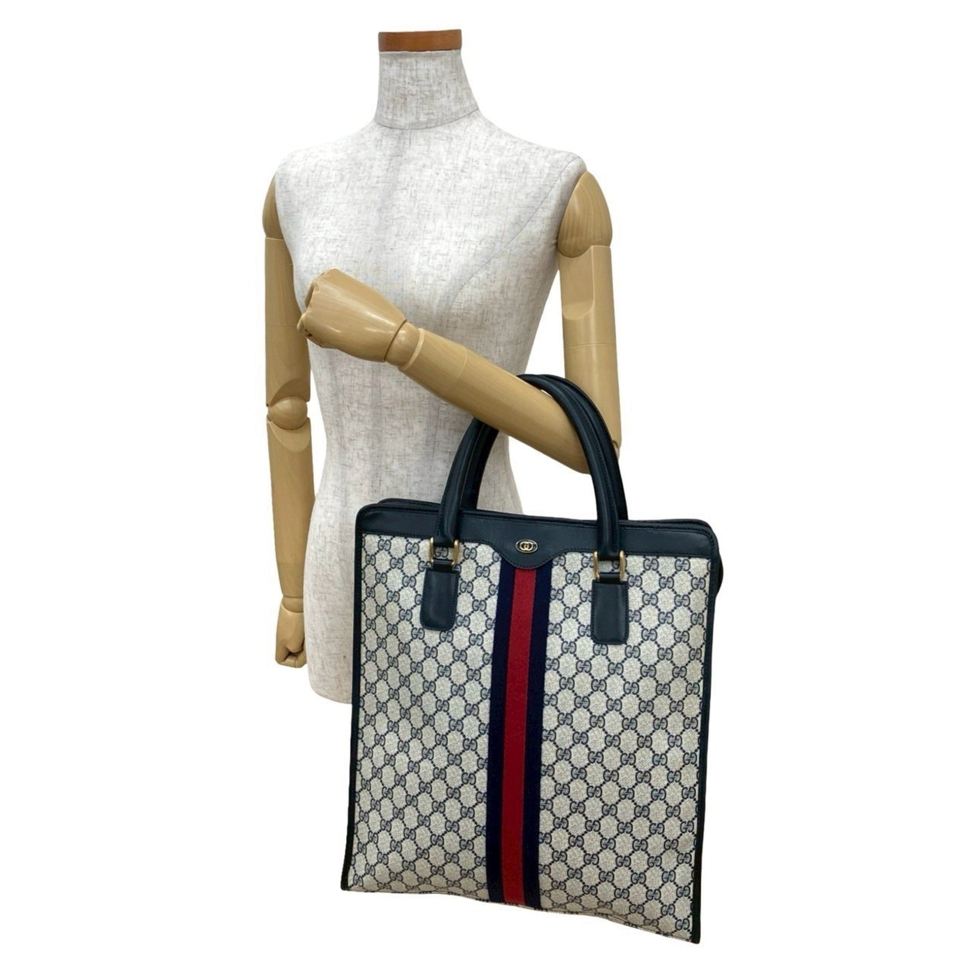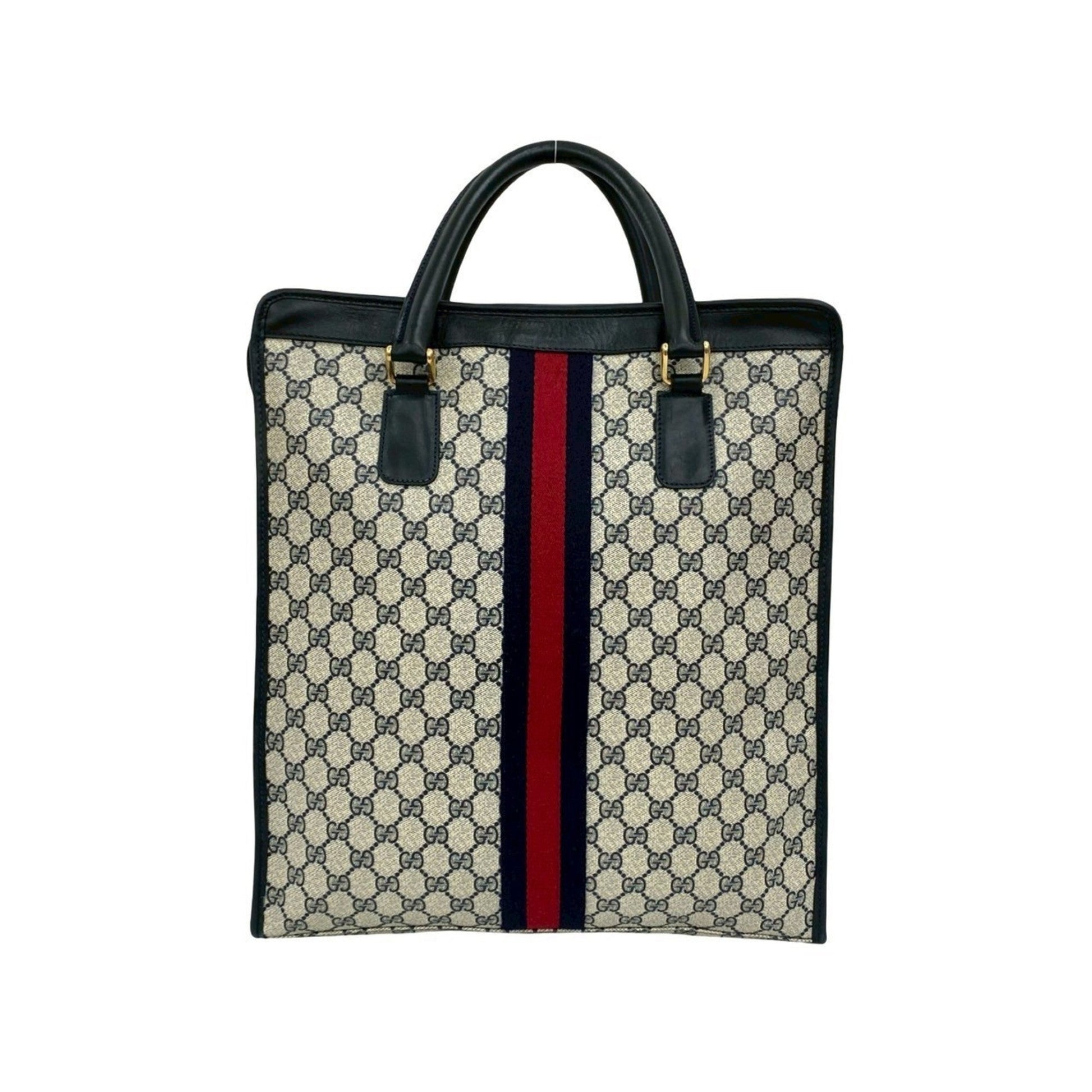 Brand: Gucci, Color: Navy, Red color, Material: Leather, PVC, Dimensions: 41cm x 36cm x 7cm / 16.14'' x 14.17'' x 2.75'', Condition: Rank AB. Rank AB Used - Traces of usage, scratches / dirt can be seen but generally in good condition. Before purchasing, please refer to the images for the exact condition of the item. Before purchasing, please refer to the images of the accessories included with the item. Damage Ranking: Slight