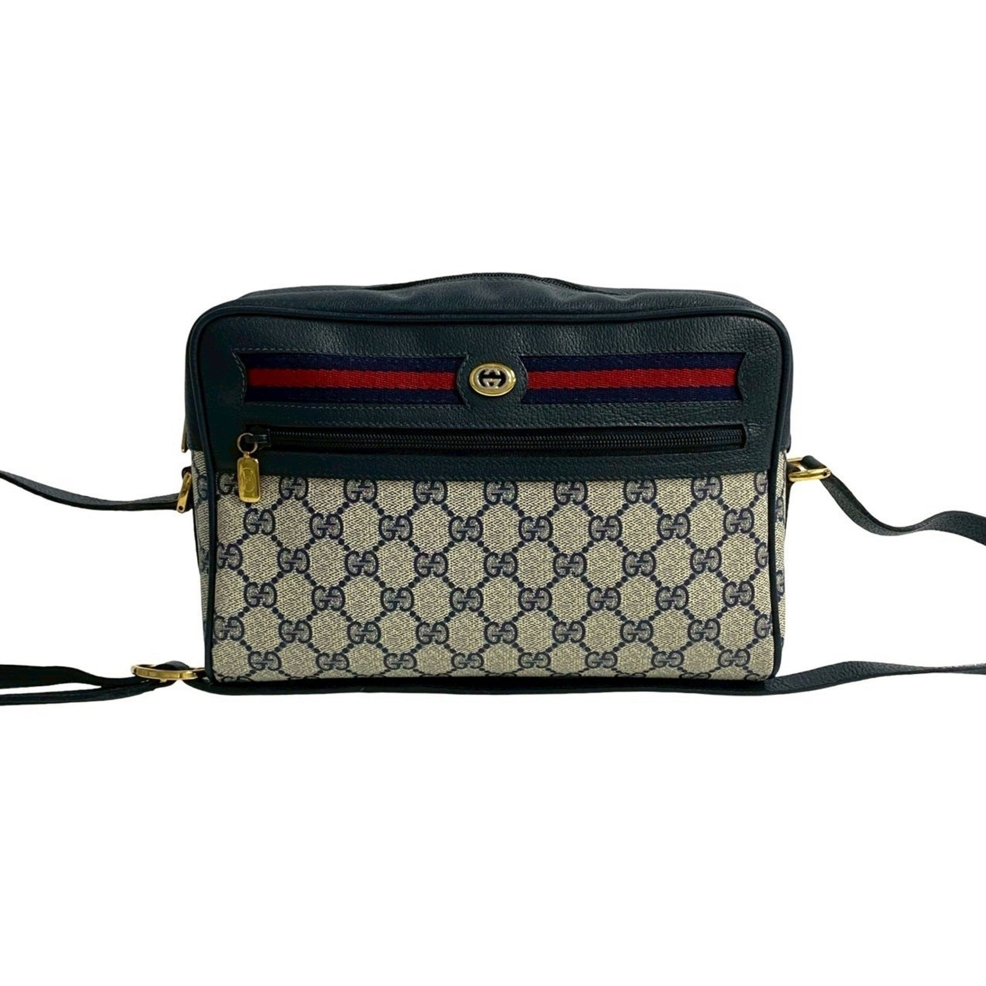Brand: Gucci, Color: Navy, Red color, Material: Leather, PVC, Dimensions: 25.5cm x 18cm x 7.5cm / 10.03'' x 7.08'' x 2.95'', Condition: Rank AB. Rank AB Used - Traces of usage, scratches / dirt can be seen but generally in good condition. Before purchasing, please refer to the images for the exact condition of the item. Before purchasing, please refer to the images of the accessories included with the item. Damage Ranking: Slight