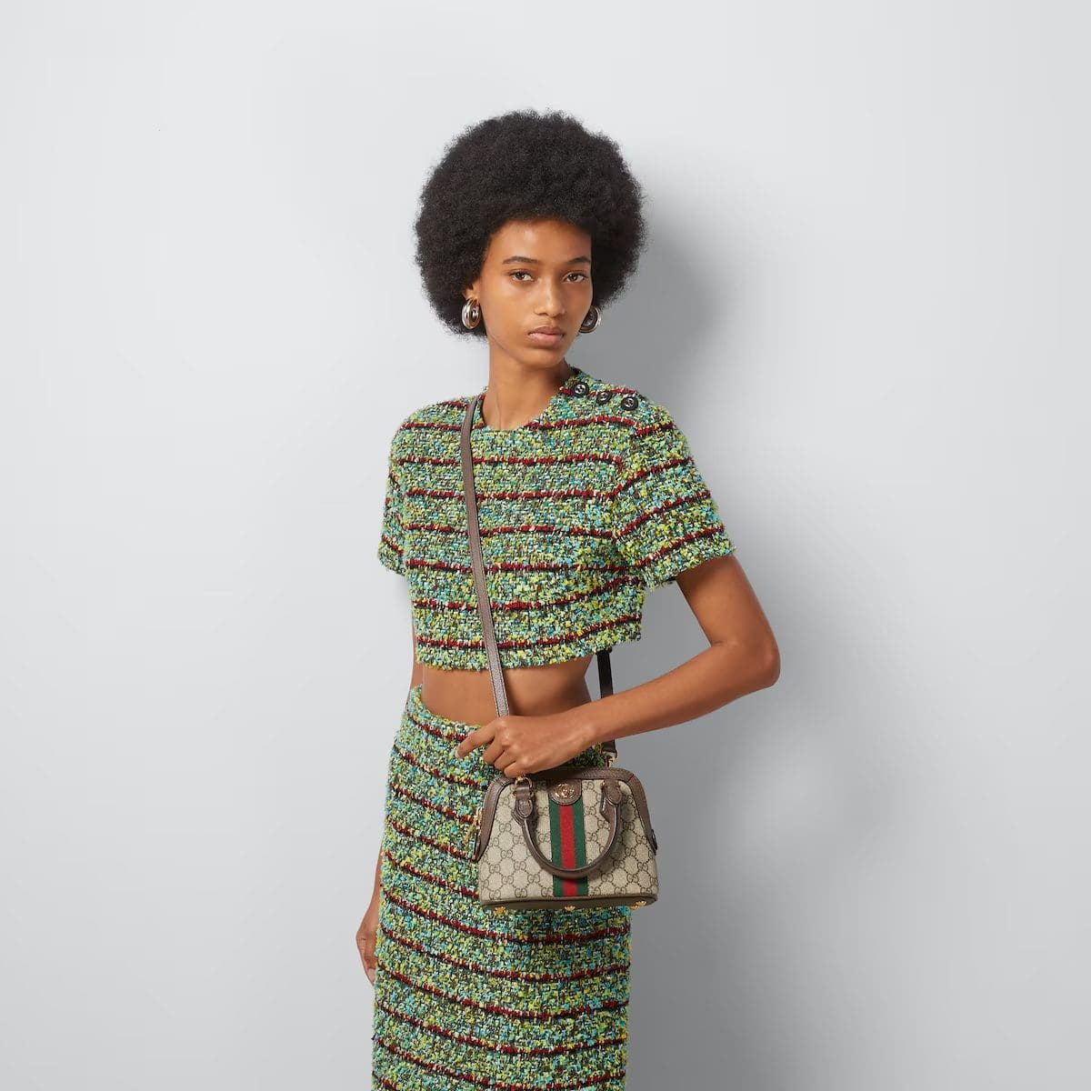 The Ophidia line is further elevated through new sizes and styles including a top handle mini version with double handle. This super mini bag appears as part of the line with well-known features such as the Web and Double G.