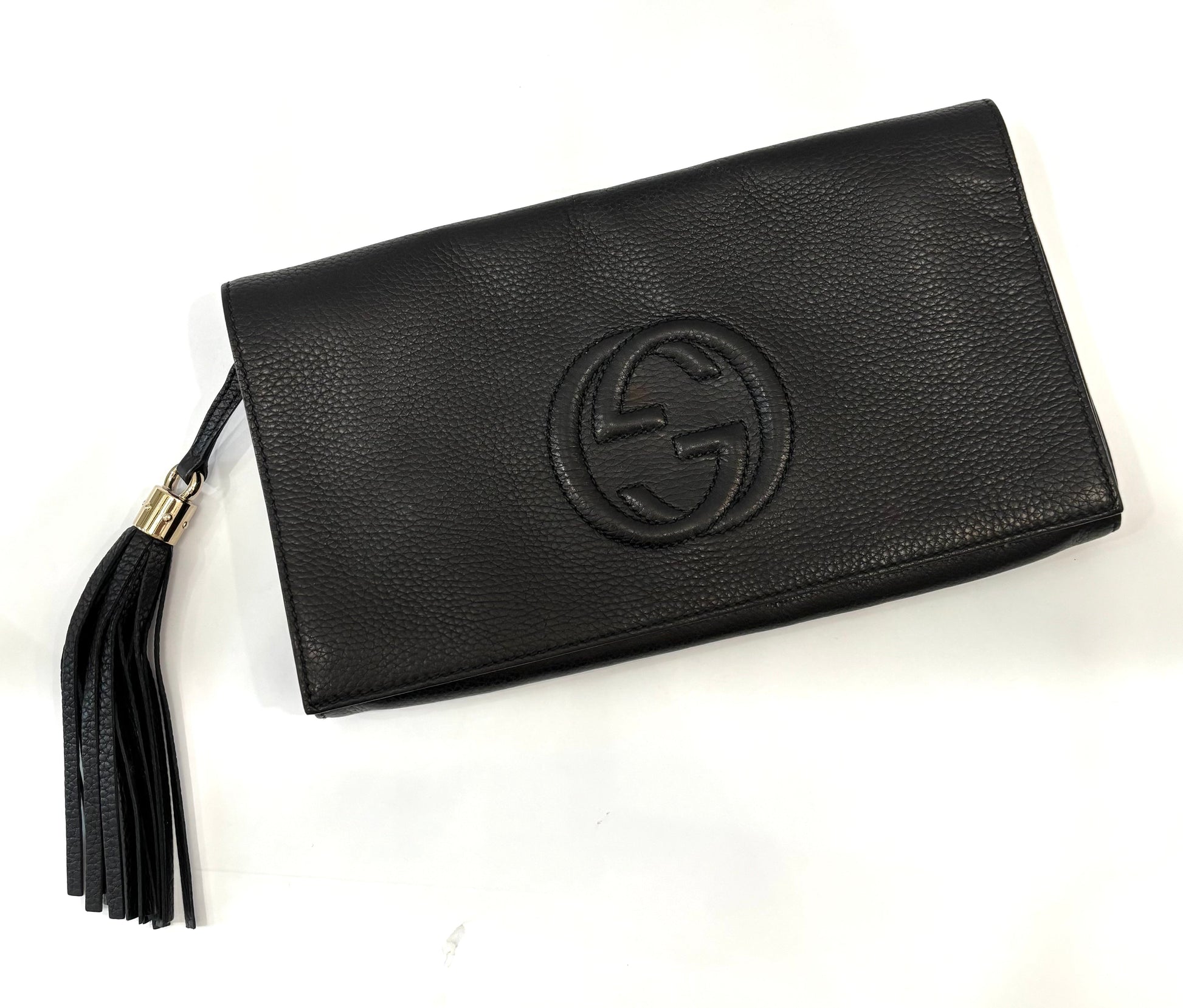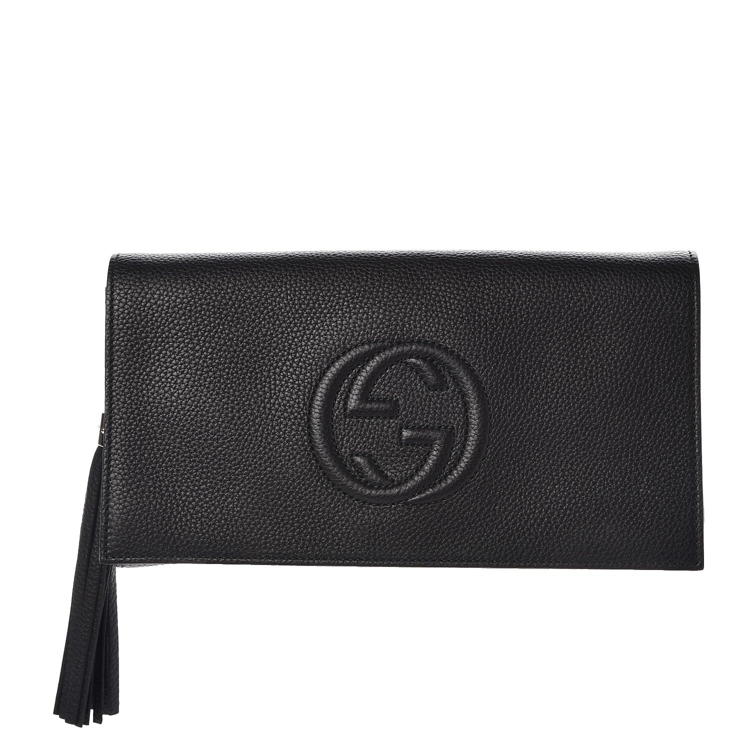 Elevate your evening ensemble with this sophisticated Gucci Soho clutch, crafted from rich black pebbled calfskin leather. The sleek design features the iconic interlocking GG embossed on the front flap, showcasing Gucci's timeless style.