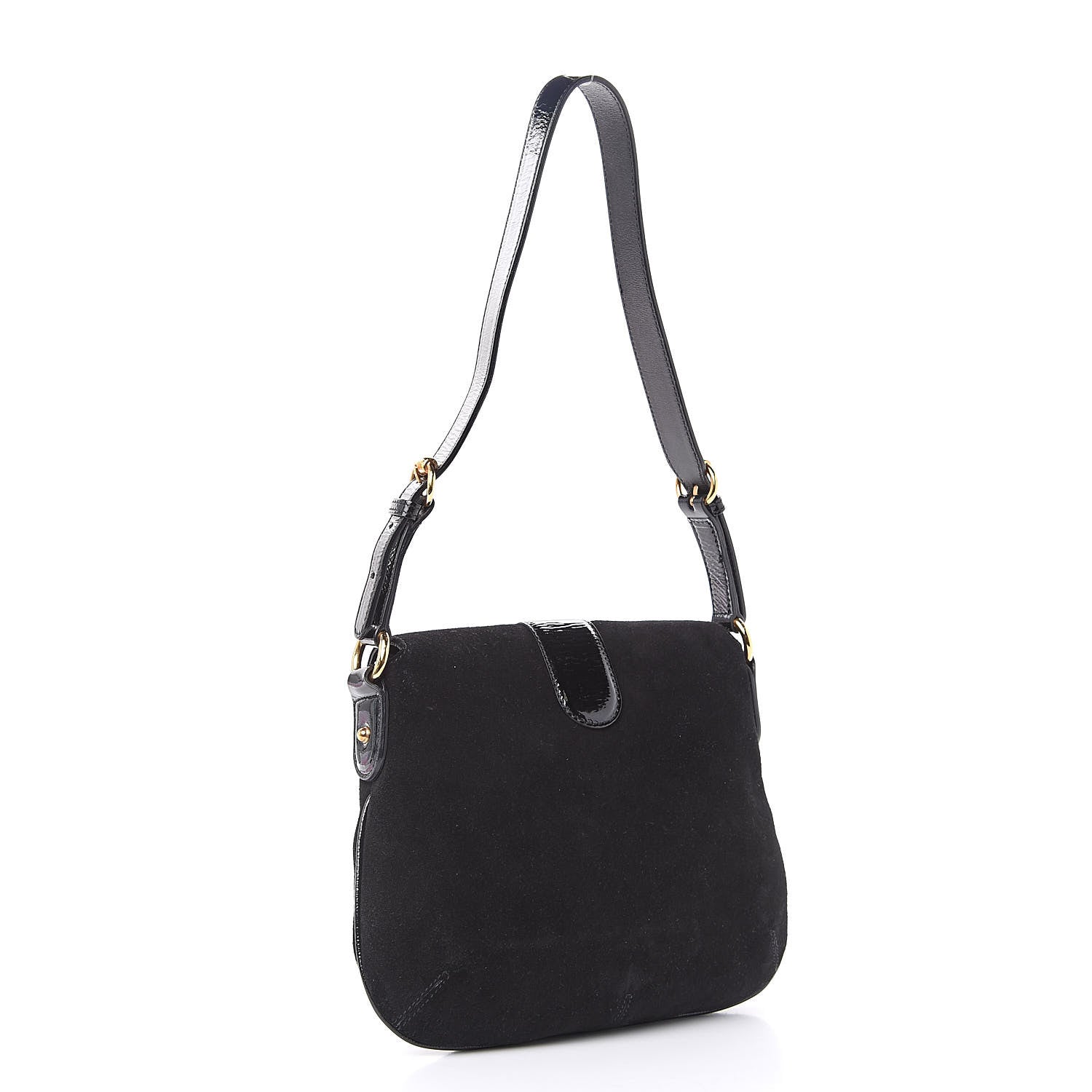 This Fabulous bag is constructed of black suede leather with patent leather trim and accents. The flap opens to a fabric interior with a striped textile and a zipper pocket.