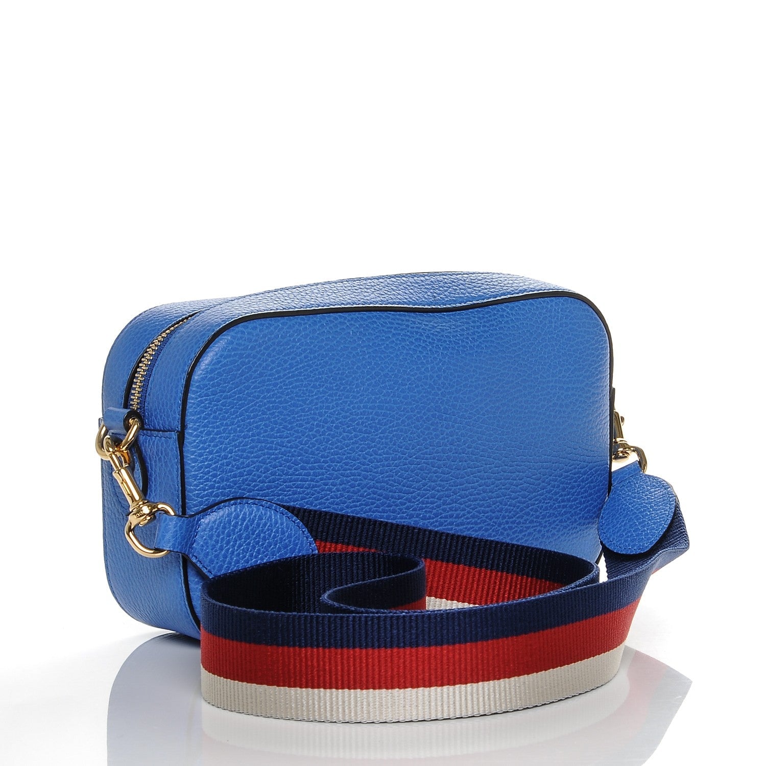 This stylish crossbody is crafted of blue calfskin leather with printed tiger graphics. This crossbody features a blue, white, and red canvas web shoulder strap and the top zipper opens to a beige course linen interior.