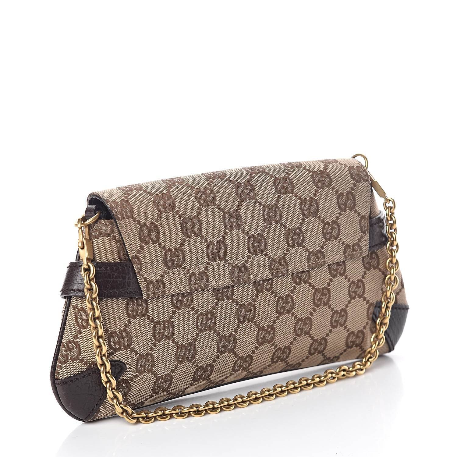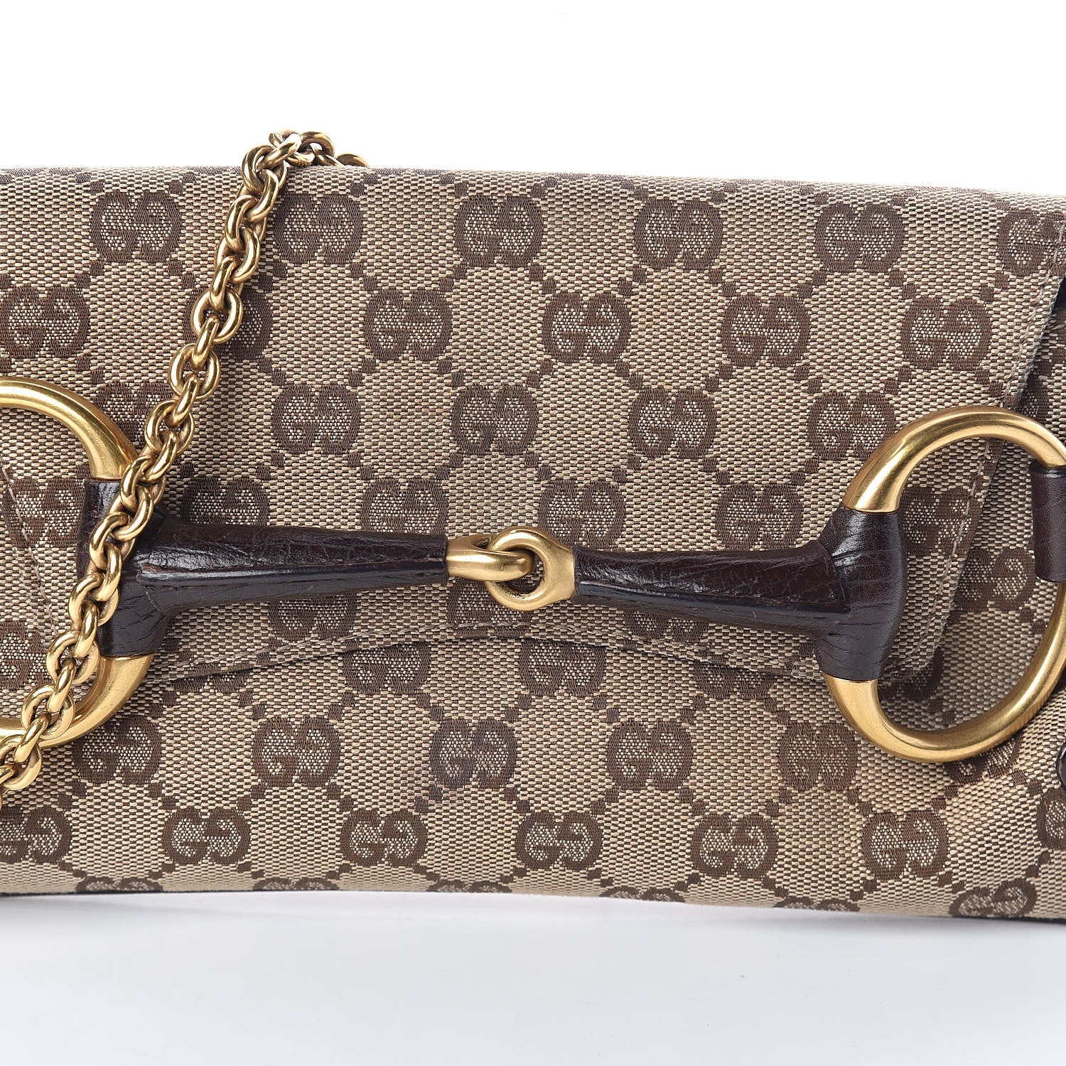 Crafted of classic monogram GG canvas with dark brown leather trim. This clutch includes a large horse-bit detail on the front and a detachable gold chain strap. The bag opens to a brown fabric interior with a patch pocket.
