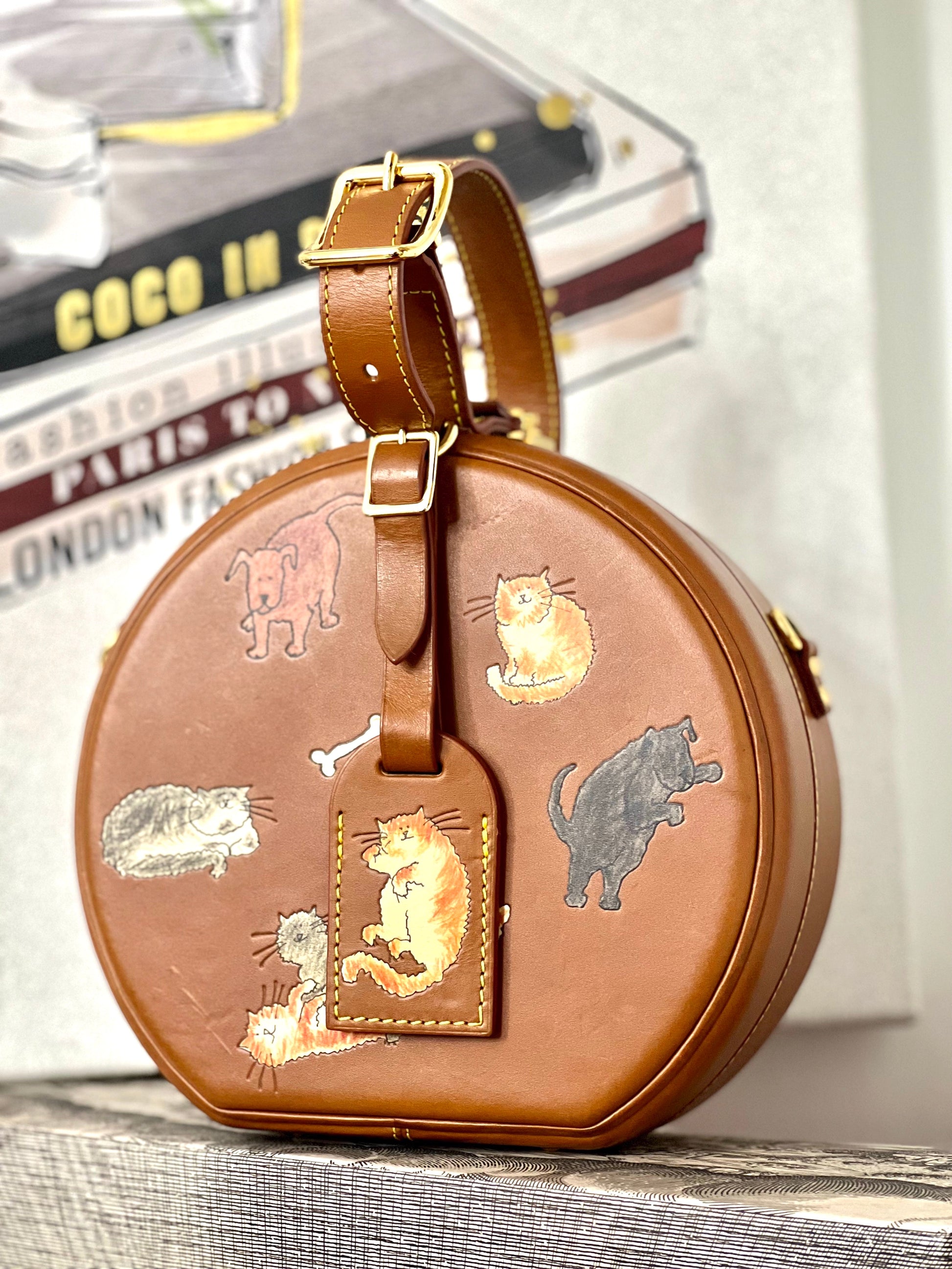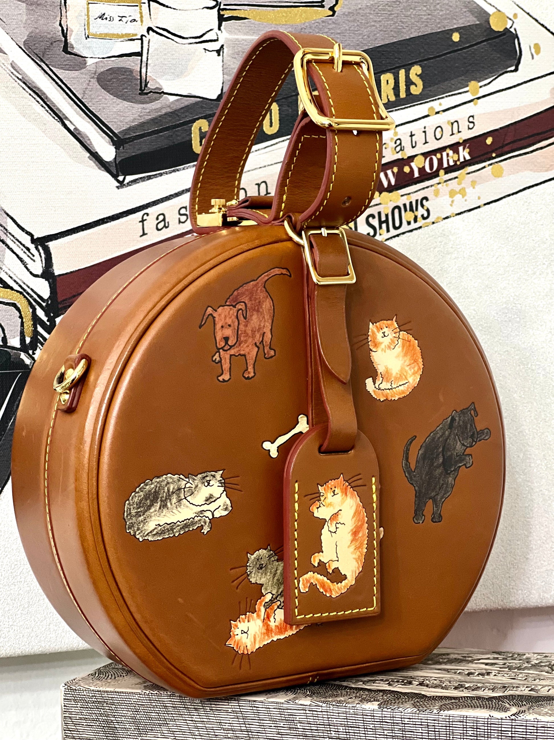 Louis Vuitton’s artistic director Nicolas Ghesquière agrees. In a capsule collection named the Catogram, he teams up with iconic creative director Grace Coddington and the result is a perfect pairing of cats (and dogs) on luxurious calfskin leather. This hat box-inspired bag is emblazoned with quirky cat and dog drawings. It features an adjustable top handle with a polished brass press lock closure and an optional, adjustable shoulder strap with matching brass hardware. The bag opens to a beige leather interior with a patch pocket, and room for your phone and essentials.