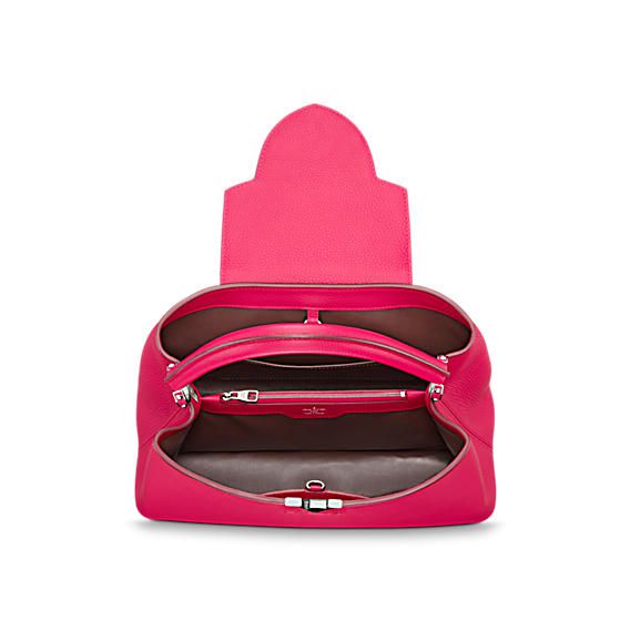 This timelessly elegant Capucines bag is a testament to fine leather craftsmanship. In full-grain Taurillon leather, it combines refined details, including a semi-rigid handle secured by jewel-like rings, with a spacious, functional shape offering two inside compartments. Its distinctive flap can be worn in two ways: outside to reveal the outline of a Monogram flower, or inside to show the LV initials.