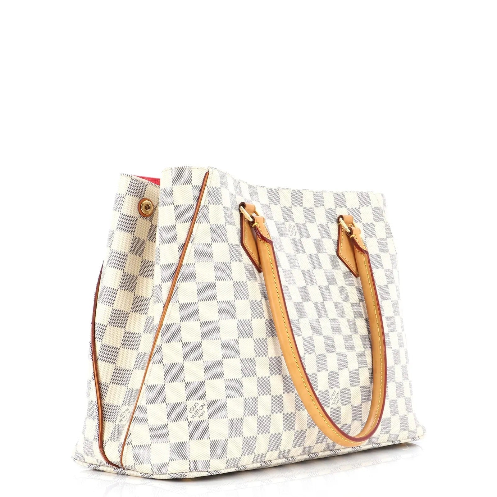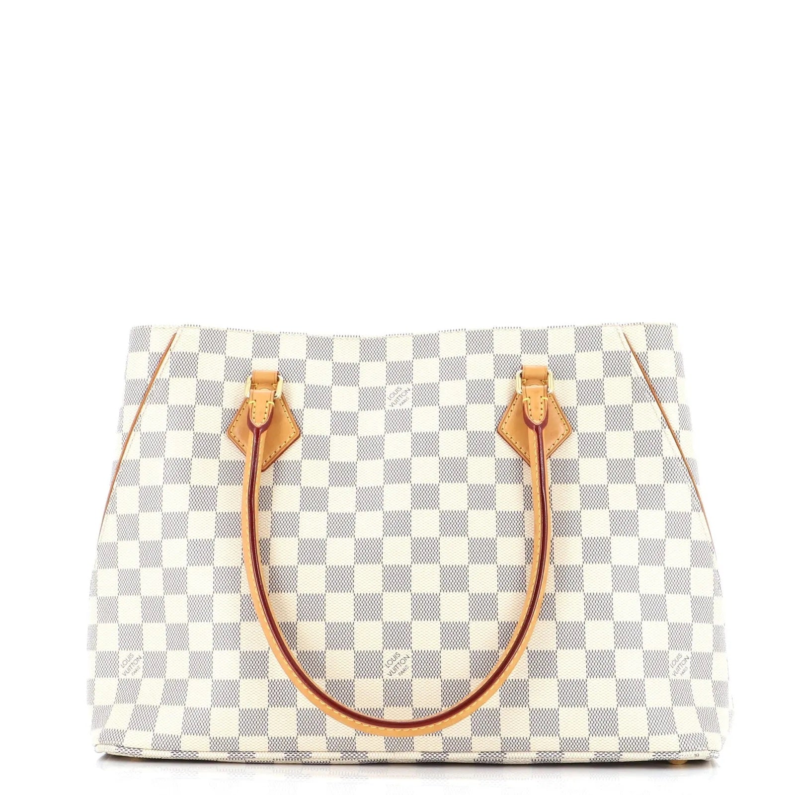 This Louis Vuitton Damier Azur Canvas Calvi Bag has fashion and functionality all rolled into one. With its expandable sides and roomy capacity, it will hold all your daily essentials in style.