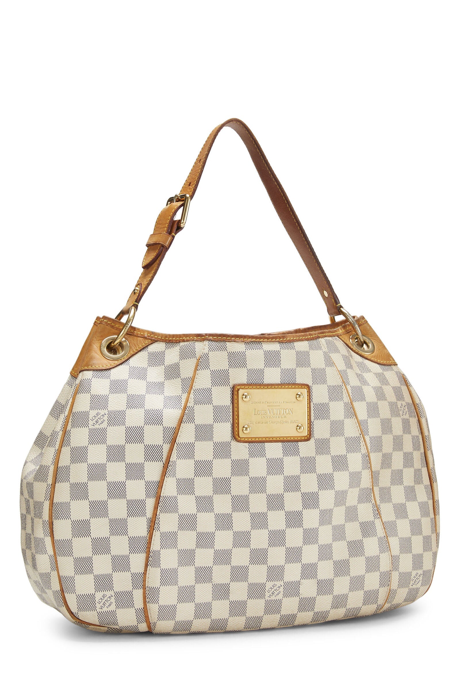 Classic and spacious Louis Vuitton Galliera PM crafted in the VUITTON house's signature Damier Azur check coated canvas with natural Vachetta leather accents and finished with gold-tone brass hardware.