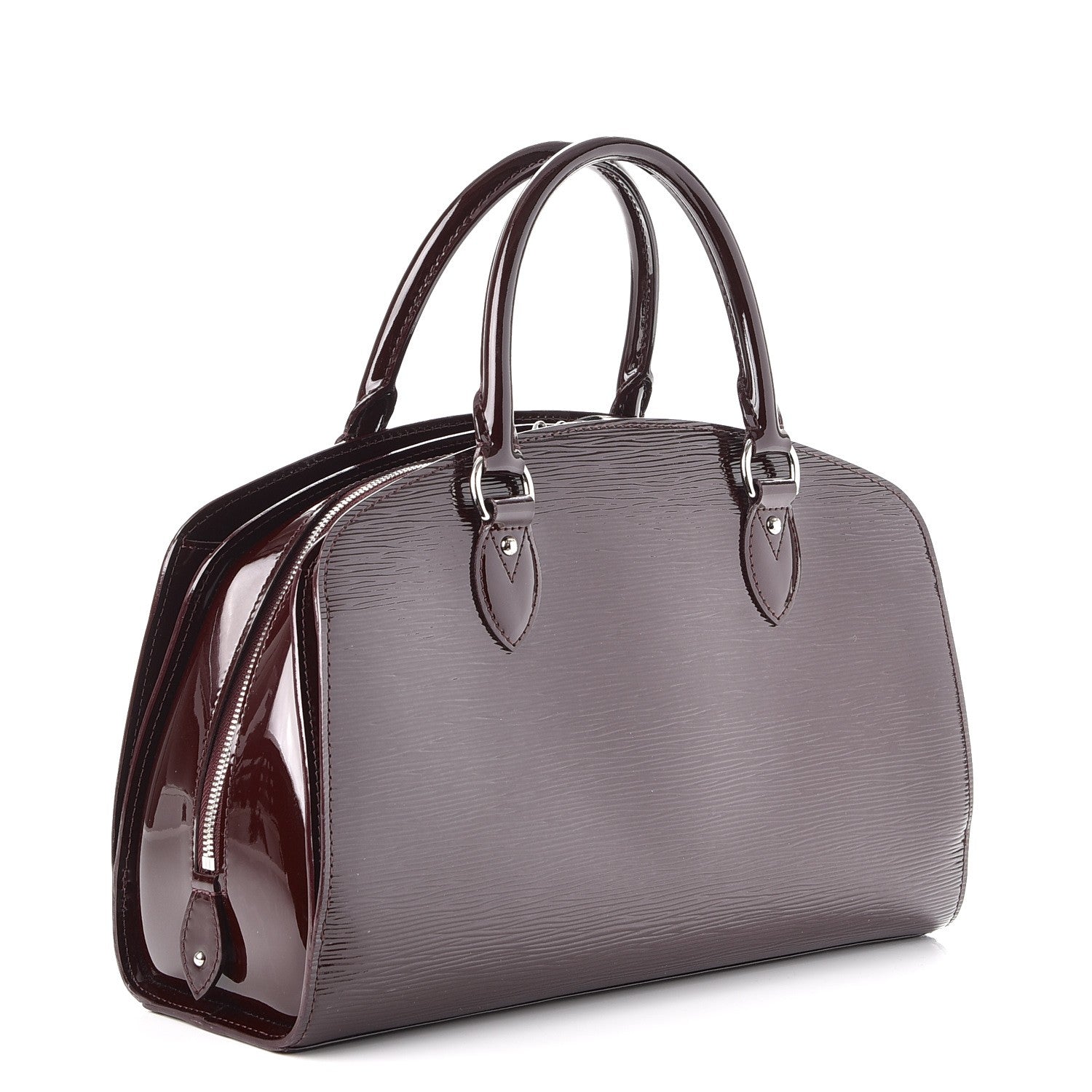 This bag is crafted of EPI leather in the color prune with double-rolled handles and silver hardware. Lock and key included.