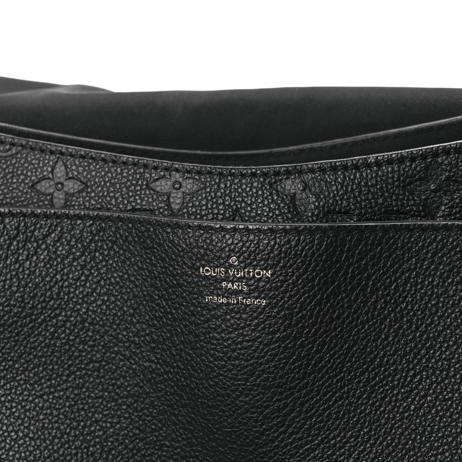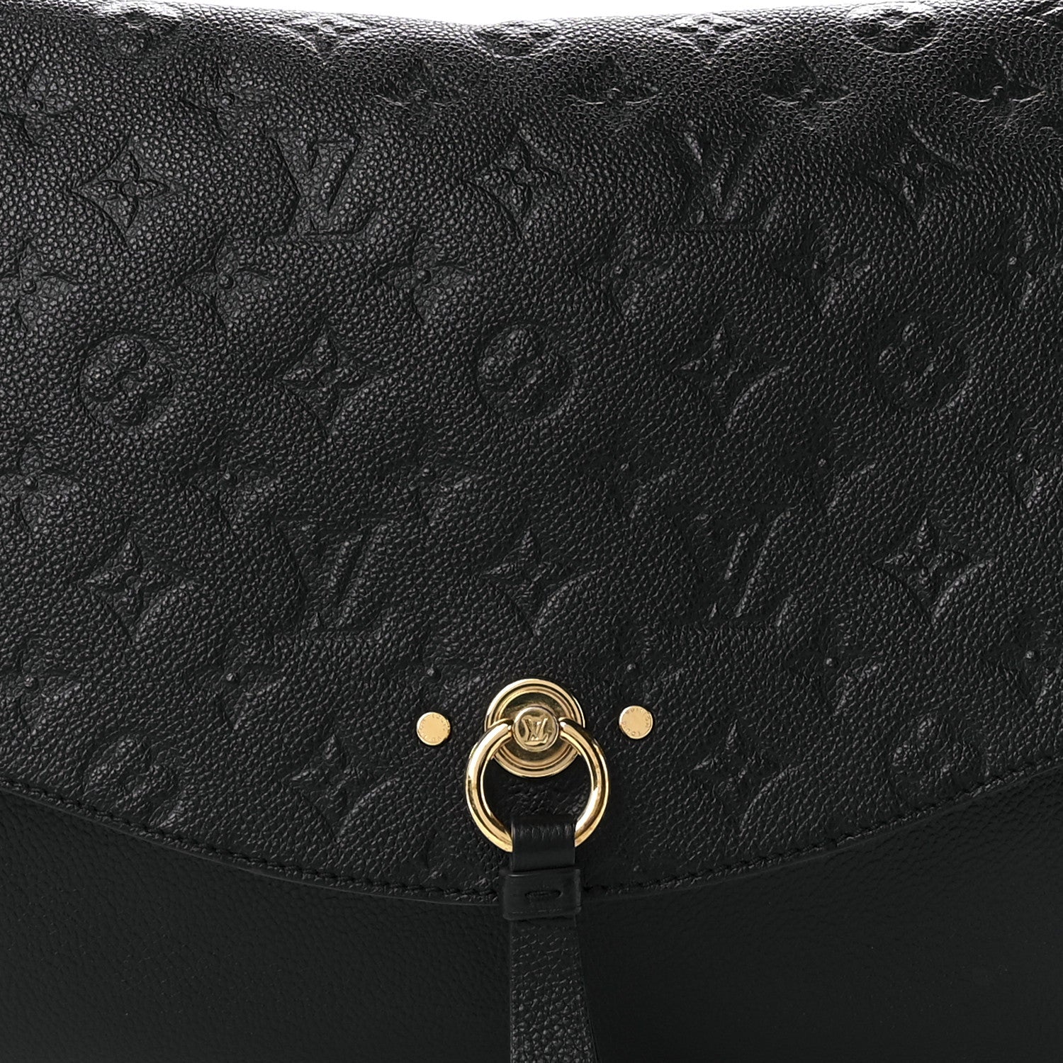 Crafted of luxurious Louis Vuitton monogram embossed leather in black. The bag features a front-facing flat pocket, a leather top handle, a polished gold chain link shoulder strap with a shoulder pad, and a polished gold press lock on the crossover flap. This opens to a black fabric interior with patch pockets.