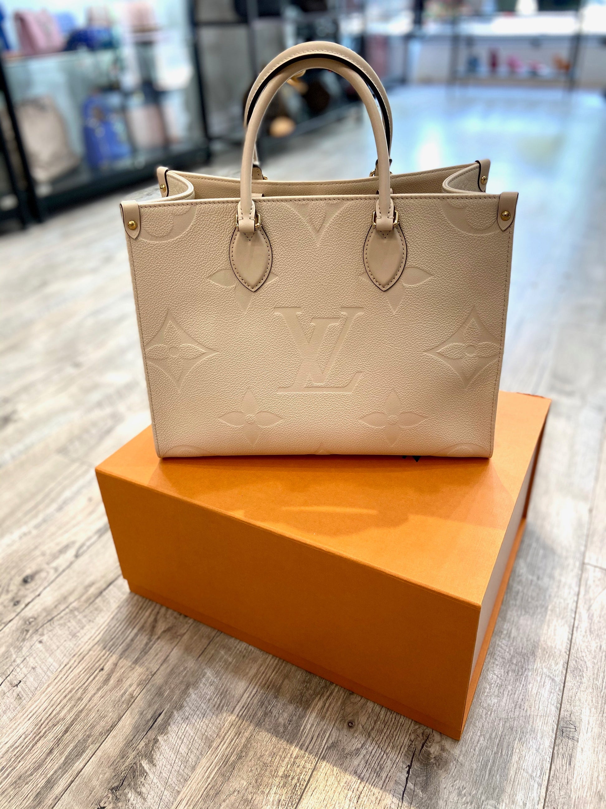 Super Stylish " On The Go" Grained Monogram Empreinte Leather Tote in Cream, a soft leather that is embossed with a large and modern Monogram pattern. Thanks to the square shape, it boasts a generous capacity and can easily fit a laptop. Its articulated top handles and shoulder straps give carrying options.